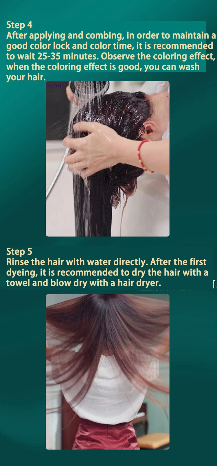 Шаг 4: после нанесения и расчесывания рекомендуется подождать 25-35 минут, чтобы сохранить хороший цветной замок и время окраски. Обратите внимание на эффект окраски, когда эффект окраски хороший, вы можете мыть волосы.