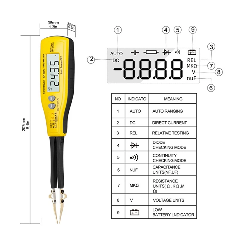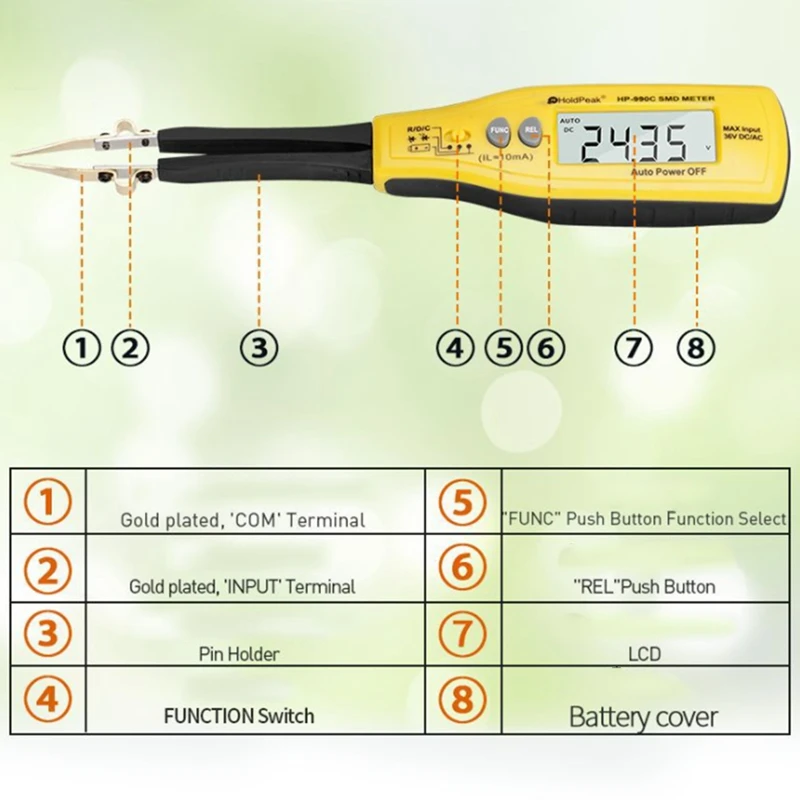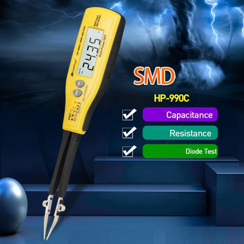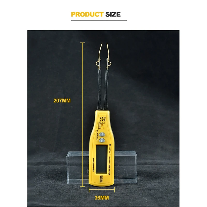 HP-990C-это портативный и работающий от батареи очень удобный маленький инструмент, который специально используется для измерения SMD (поверхностное монтажное устройство), есть резистор, конденсатор, диод, Зенер и светодиодный.