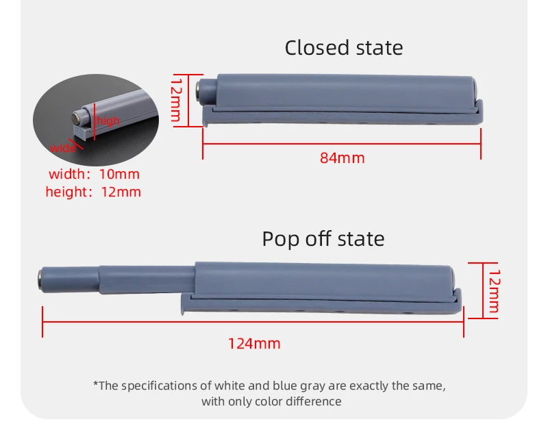 Функции продукта: он может быть установлен в шкафах, гардеробах, шкафчиках и других шкафах. Он имеет преимущества простой установки и удобного использования. Его можно открыть одним нажатием и закрыть другим нажатием. Он содержит сильную магнитную подкладку, которая может прочно адсорбировать дверь шкафа. Он принимает сплав сырья и может быть открыт и закрыт в течение 100000 раз