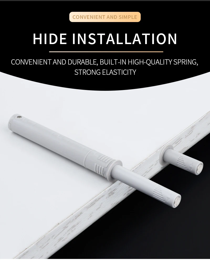 Функции продукта: он может быть установлен в шкафах, гардеробах, шкафчиках и других шкафах. Он имеет преимущества простой установки и удобного использования. Его можно открыть одним нажатием и закрыть другим нажатием. Он содержит сильную магнитную подкладку, которая может прочно адсорбировать дверь шкафа. Он принимает сплав сырья и может быть открыт и закрыт в течение 100000 раз