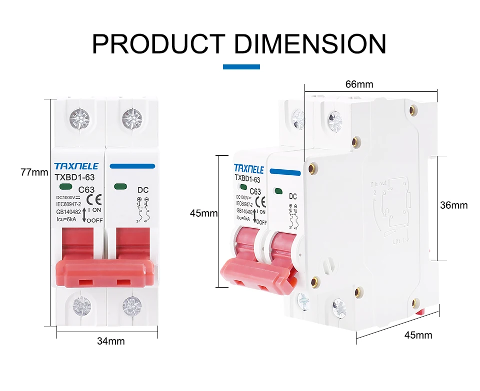 Миниатюрный автоматический выключатель TXBD1-63 серии DC, он в основном используется для перегрузки и защиты от короткого замыкания в системе распределения постоянного тока и Солнечной PV системе.
