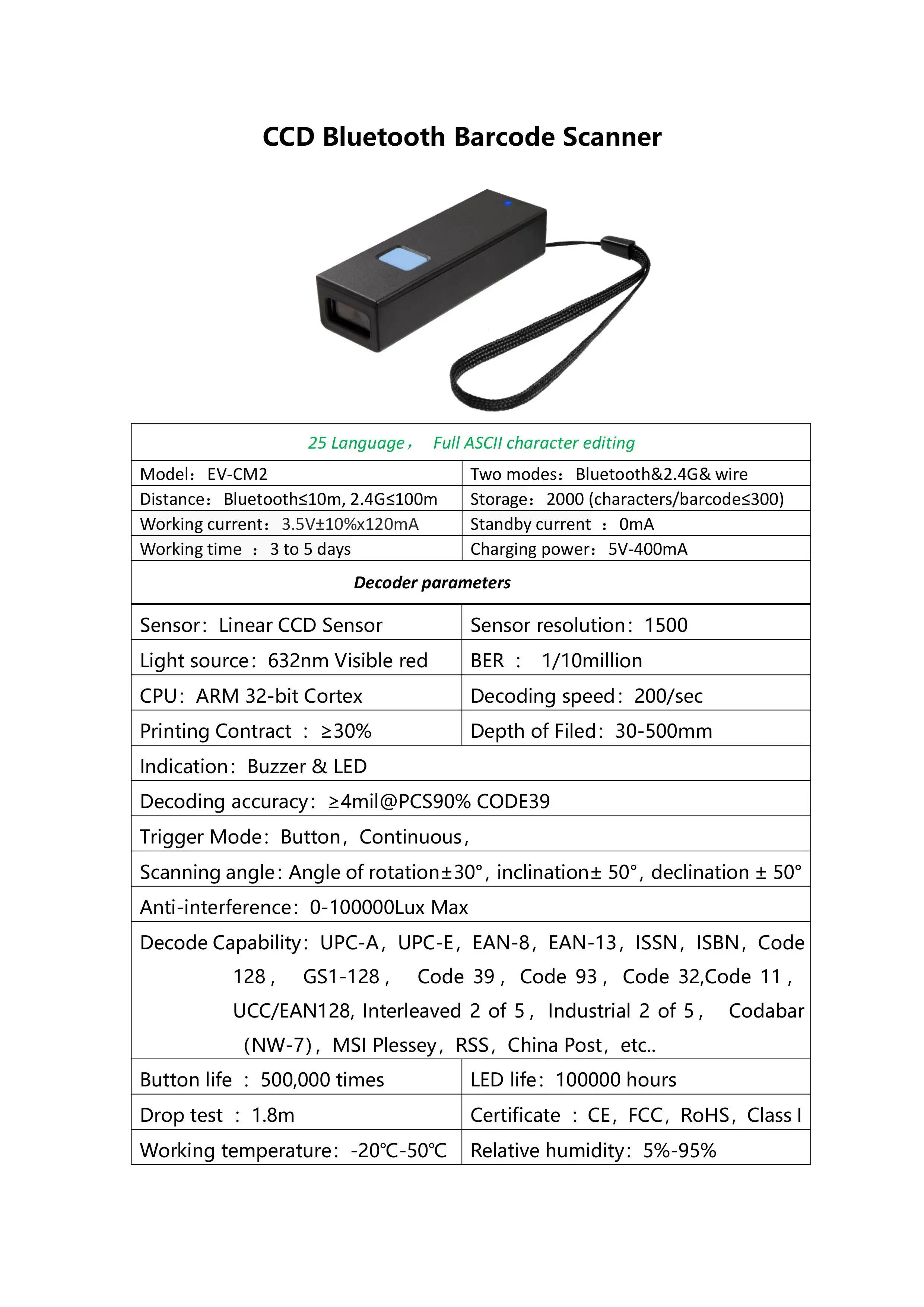 DescriptionEVAWGIB EV-CM2 Mini Size Protable Barcode Scanner (USB & 2.4GHz & Bluetooth 3-in-1)