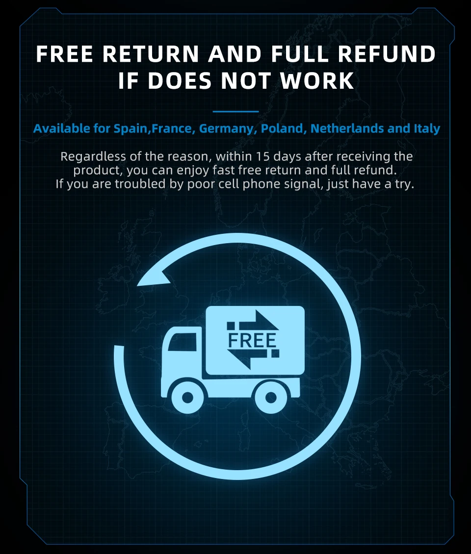 Независимо от того, по причине в течение 15 дней после получения товара, вы можете наслаждаться быстрая Бесплатная возврат и полный возврат. Если вы обеспокоены из-за плохой сигнал сотового телефона, попробуйте заказать.