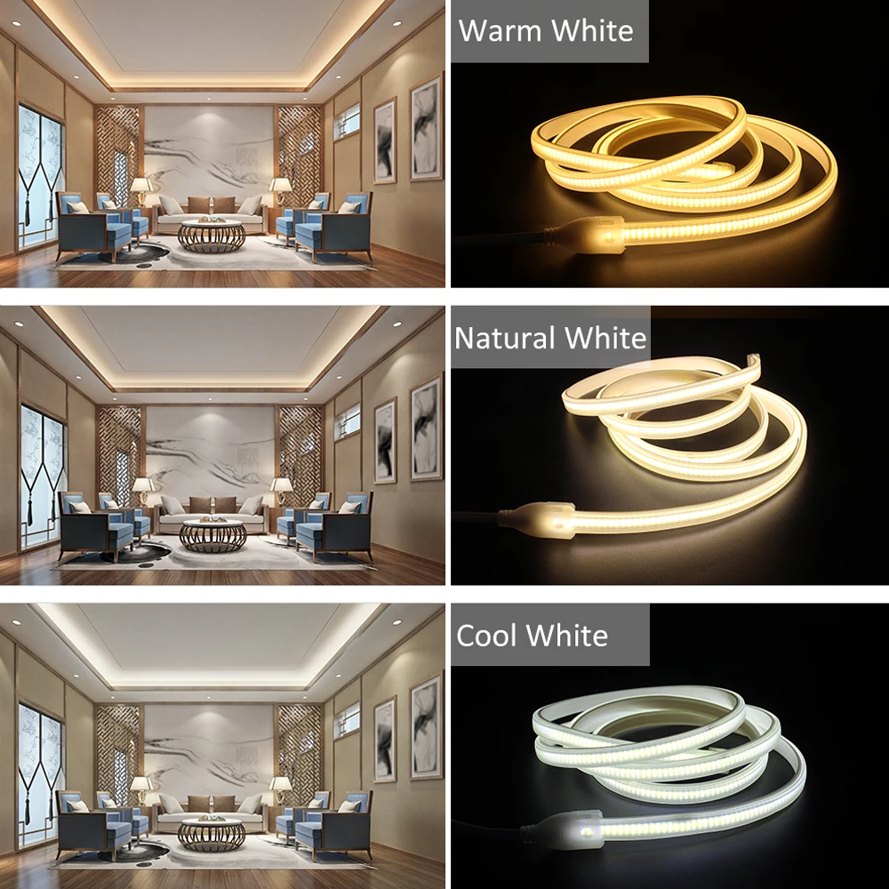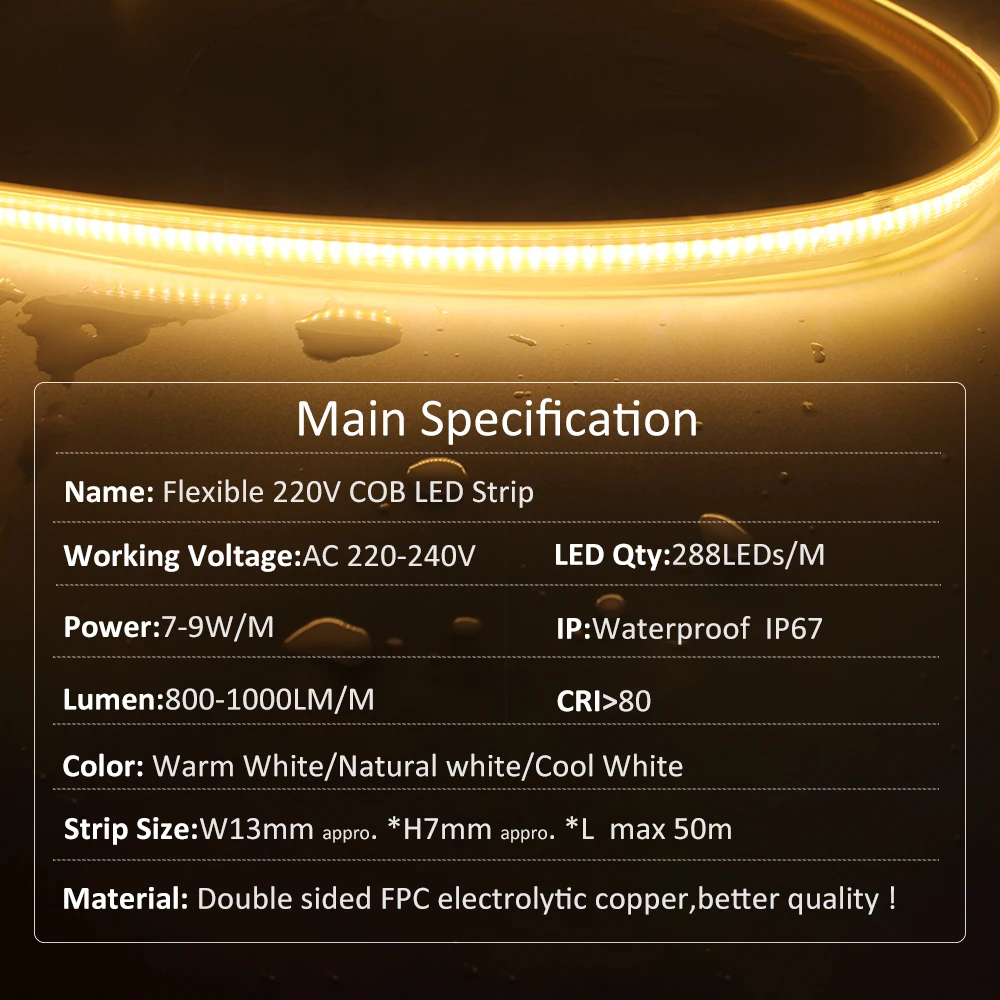 AC220V COB Светодиодная лента высокой плотности гибкий IP67 Водонепроницаемый 288 светодиодов/м 9 Вт/м высокая яркость 3000 К 4000 к 6000 К