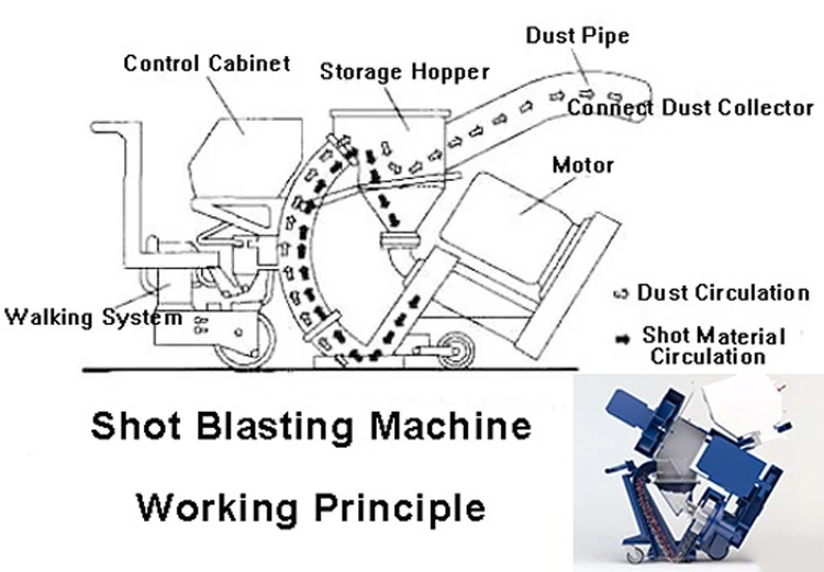 Автоматическая дробеструйная машина состоит из передвижной тележки (пульт дистанционного управления), машины, камеры дробеструйной обработки, камеры хранения, сепаратора песка, двухступенчатой системы сбора пыли, пыли, пневматическое устройство и электрическое управляющее устройство.