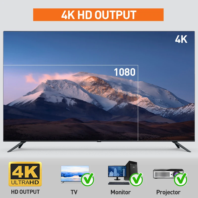 4K HD disply, совместим с телевизором, монитором, проектором и т. д. Наслаждайтесь hd-видео.