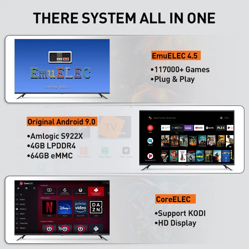Оригинальный Android TV 9,0 + EmuELEC 4,5 + CoreELEC система все в одном ТВ коробке. Играйте в классические ретро-игры, смотрите фильмы HD TV, легко Получайте доступ к Google, Netflix, Youtube и т. д.