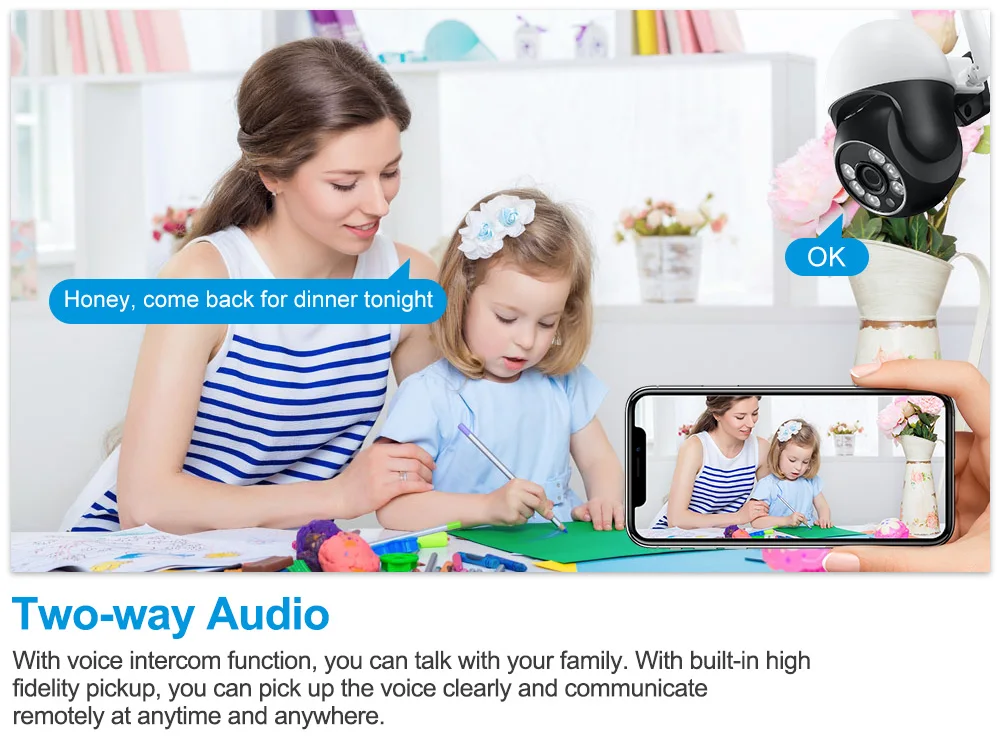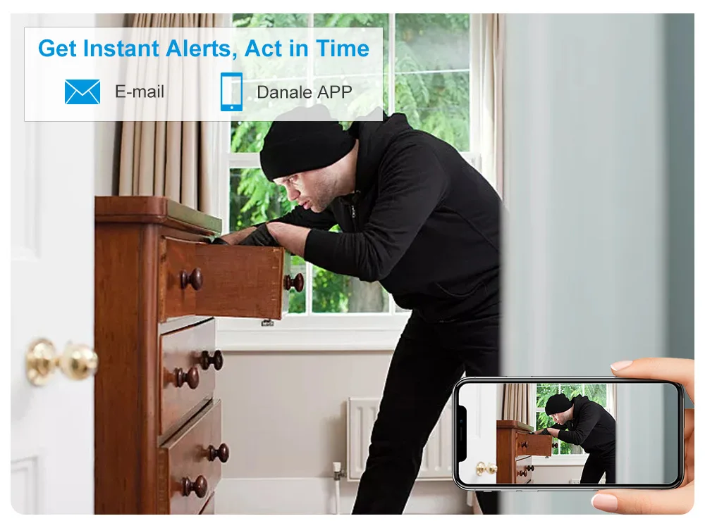 Объектив этой камеры можно поворачивать, вы можете увидеть более широкую область, удаленно управляя камерой на вашем мобильном телефоне, так что мониторинг не оставляет слепых зон.Интеллектуальное обнаружение движения и мгновенные оповещения