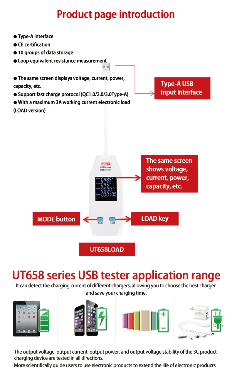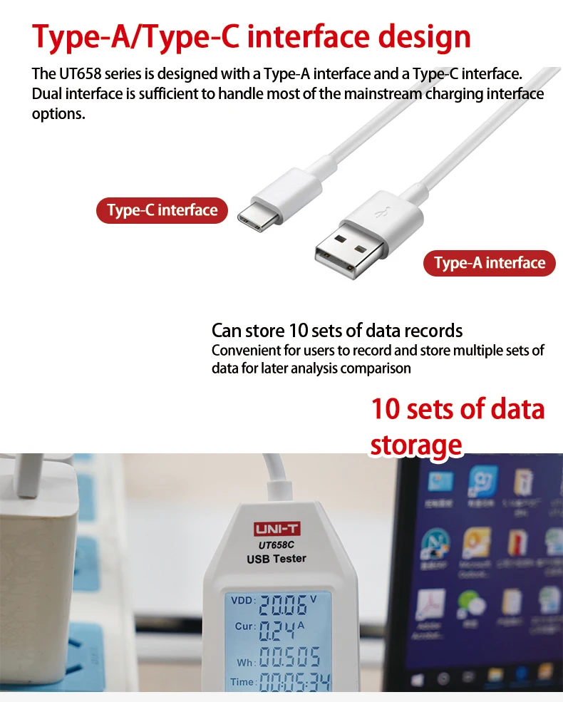 The second generation UT658 series USB testers can inspect USB chargers, portable power sources, data cables and other electronics charging devices.