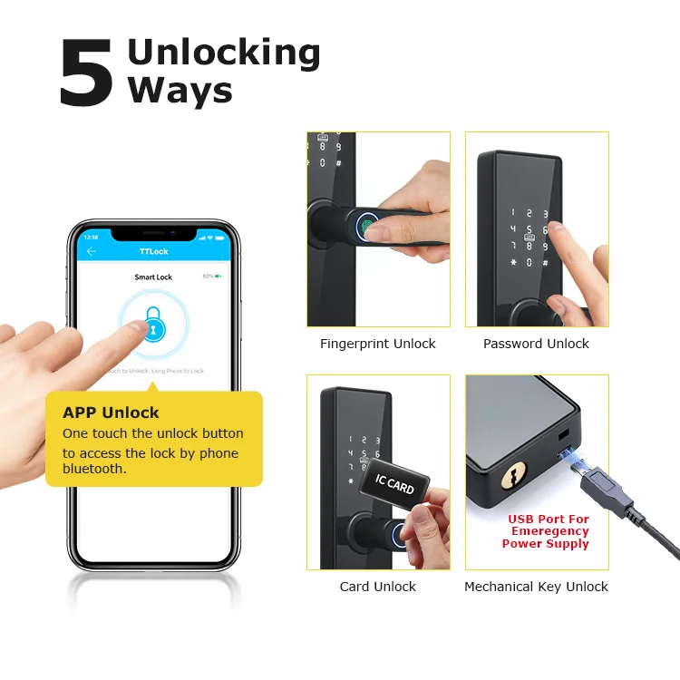 5-в-1 бесключевого доступа Дверные замки, где не видно отпечатков пальцев, пароль, микросхемой чипом микропроцессорные карты, приложение, резервное копирование ключей. Функция Smart: Автоматическая блокировка, функция анти-разблокировки, режим прохода, Удаленная разблокировка (через приложение). Качественно и аккуратно признали ваши отпечатки пальцев, всего в 0,3 секунд и открыть дверь в течение 1 секунды. Отклонение сложных процедур разблокировки. Отличное умное домашнее устройство для дома, квартиры, офиса, отеля.
