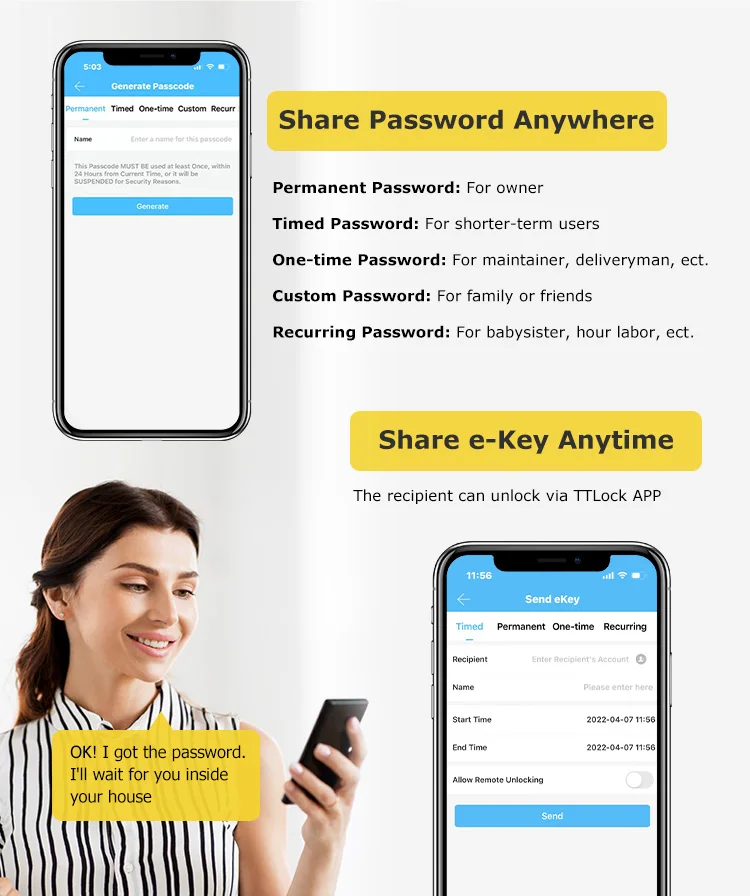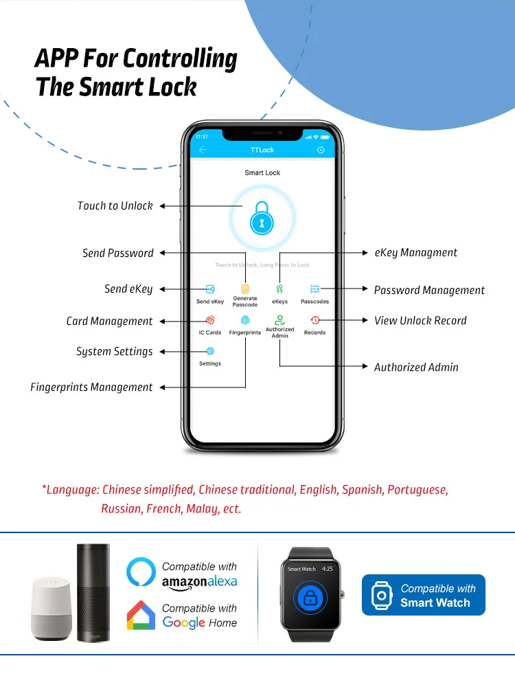 Умный Deadbolt пульт дистанционного управления-Подключите этот дверной замок отпечатков пальцев к смартфону (необходимо загрузить приложение и зарегистрировать учетную запись), вы можете удаленно генерировать время, одноразовый или индивидуальный пароль для гостей, посетителей, домохозяек, сотрудников с большим удобством, или непосредственно разблокировать удаленно