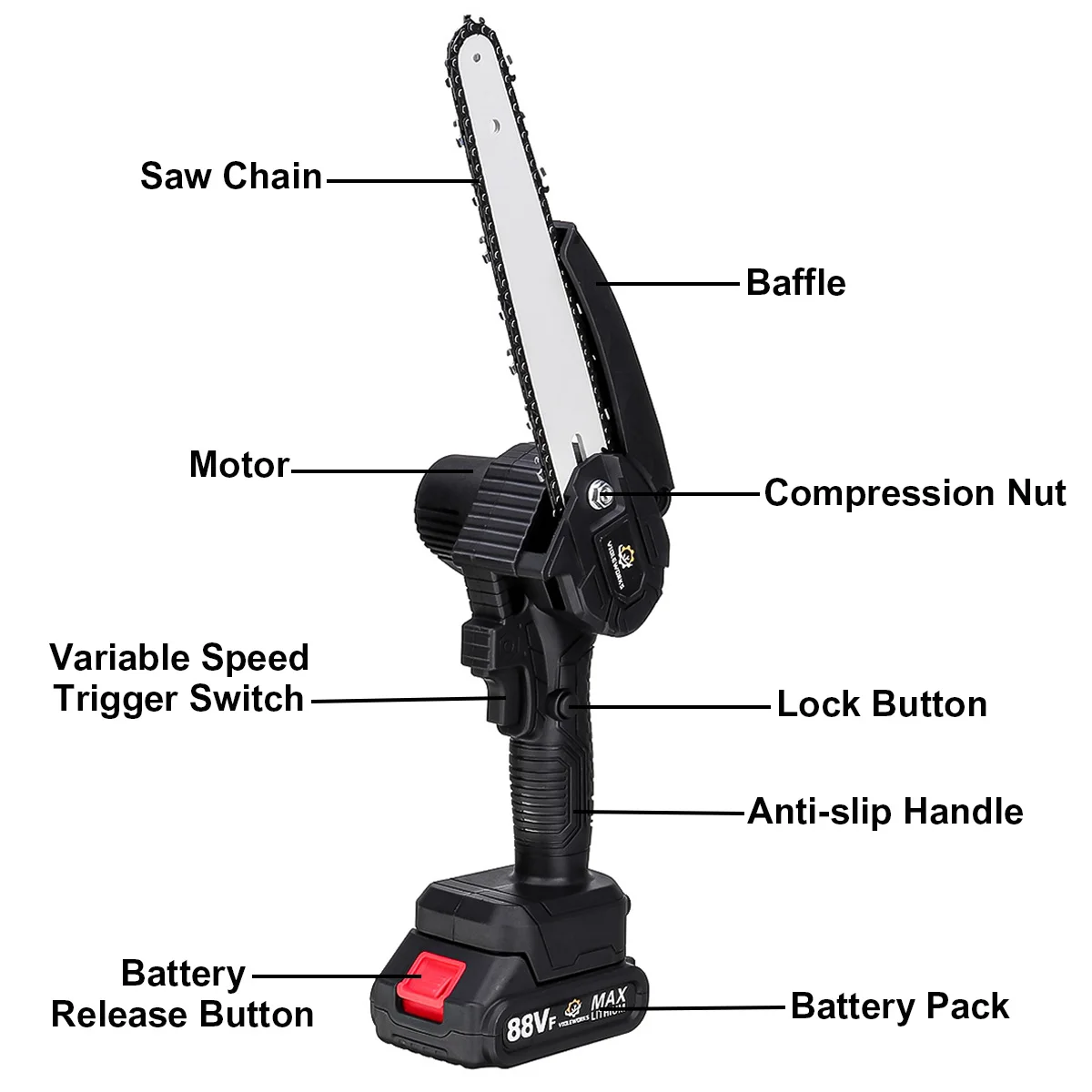 -Бесщеточный Медный двигатель: сильная мощность, более стабильная выходная мощность, чем цепная пила, Модифицированная угловым шлифовальным станком. Высокая нагрузка, так что не может легко сгореть.