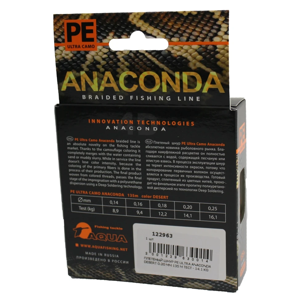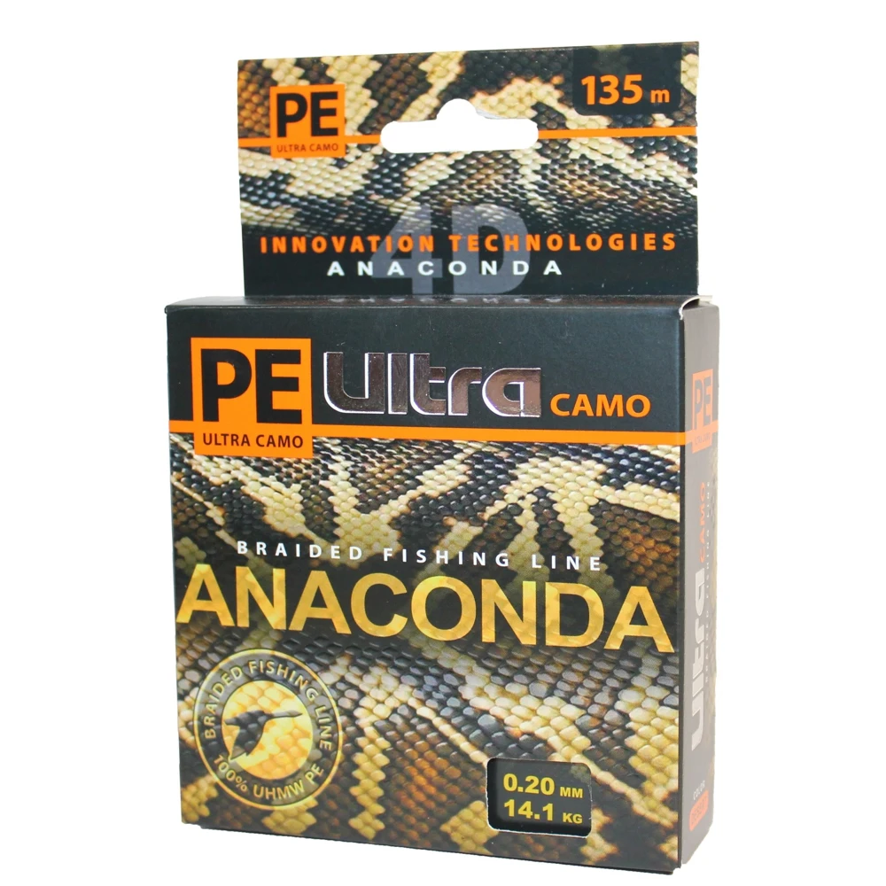 Серия плетеных шнуров для рыбалки PE Ultra Anaconda Camo Desert (135 метров) — это уникальная серия невыцветающих шнуров, пригодных для ловли в любых условиях и любыми приманками, от небольшой блесны или воблера и до тяжелого джиггера, с инновационным цветовым решением. Благодаря пиксельной камуфляжной расцветке плетенка практически на 100% сливается с водой, при любых типах грунта, будь то илистое дно, заросли водной растительности или песчаные отмели с различными примесями и взвесями. Камуфляжный окрас, не заметный в воде, хорошо различим невооруженным взглядом, и позволяет осуществлять точный контроль проводки или заброса приманки.