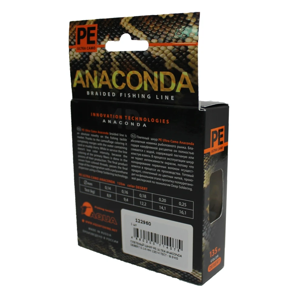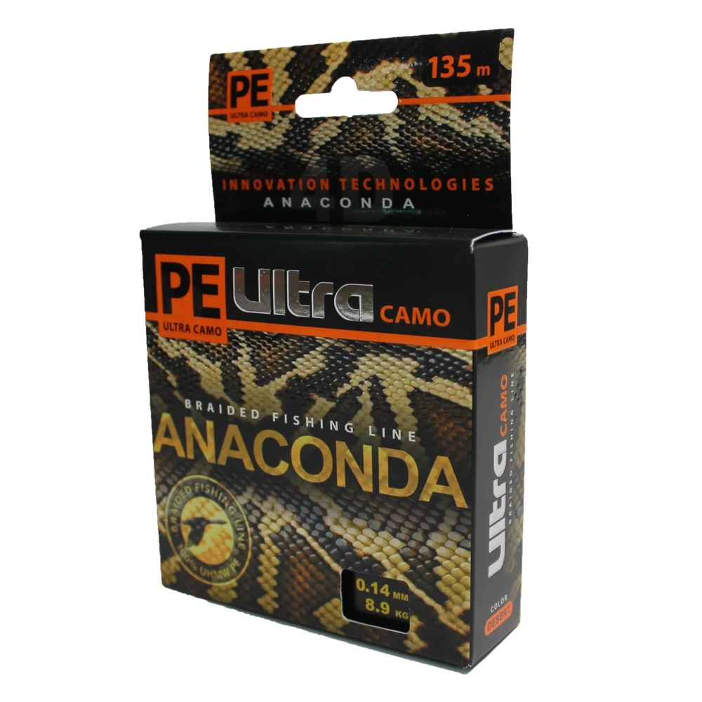 Серия плетеных шнуров для рыбалки PE Ultra Anaconda Camo Desert (135 метров) — это уникальная серия невыцветающих шнуров, пригодных для ловли в любых условиях и любыми приманками, от небольшой блесны или воблера и до тяжелого джиггера, с инновационным цветовым решением. Благодаря пиксельной камуфляжной расцветке плетенка практически на 100% сливается с водой, при любых типах грунта, будь то илистое дно, заросли водной растительности или песчаные отмели с различными примесями и взвесями. Камуфляжный окрас, не заметный в воде, хорошо различим невооруженным взглядом, и позволяет осуществлять точный контроль проводки или заброса приманки.
