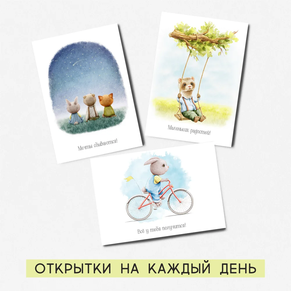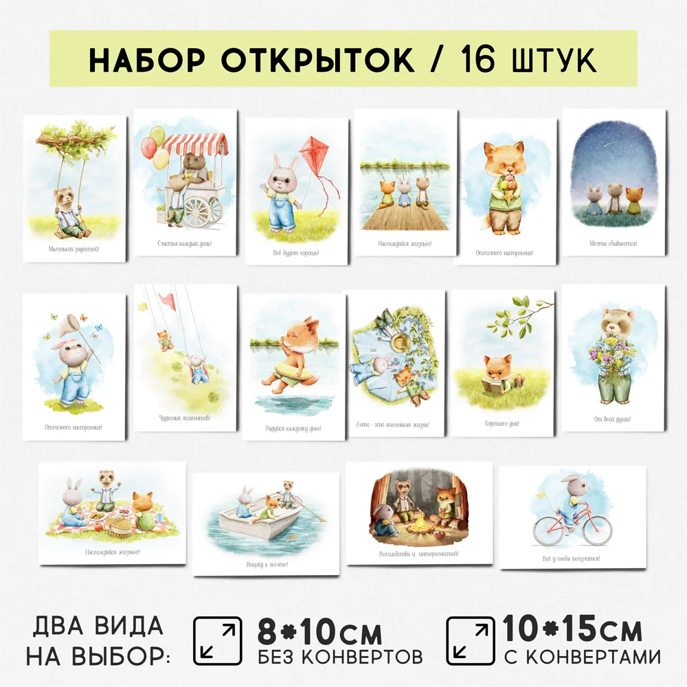 A set of 16 PCs of postcards with juicy summer watercolor scenery and cute animals!