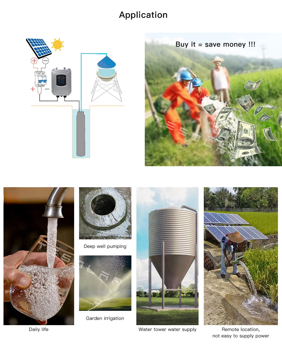 * Контроллер может использоваться в различных выходах, которые могут поддерживать стабильную выходную мощность воды. Максимальная эффективность двигателя насоса глубокого скважины может достигать до 92%. Однофазный Коэффициент мощности 0,99, что более эффективно, чем традиционный асинхронный насос.