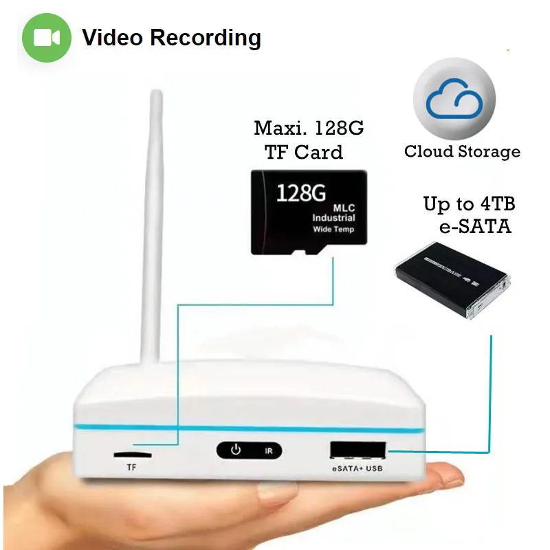 Этот сетевой видеорегистратор поддержка записи видео до макси 128 Гб TF карты, или 1*4 ТБ E-SATA на жестком диске или облачного хранилища.