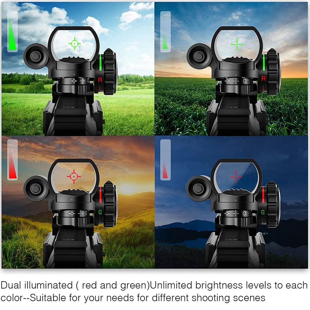 1. Светящийся рефлекторный вид с четырьмя типами сетки, это поможет вам прицелиться и точно снимать.