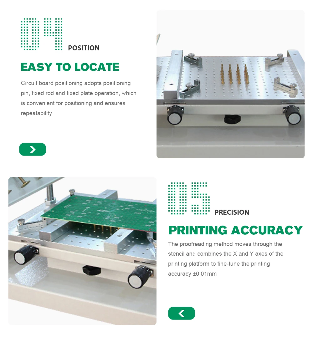 Универсальная сотовая пластина, подвижная наперсток, подвижный опорный блок, гибкая позиционирование PCB, удобно печатать двухстороннюю печатную плату. В основе используется Толстая пластина и формовочная сварка, прочная и износостойкая. Схема позиционирования принимает игла для позиционирования, фиксированного стержня и фиксированной пластины для позиционирования, что может обеспечить удобное позиционирование и точность повторной работы. Режим «Готово» выполнен через трафареты и в сочетании с тонкой регулировкой и коррекцией оси X и Y на печатной платформе, что удобно и быстро. Стент стальной сетки использует спиральный винт, можно регулировать вверх и вниз, Удобно контролировать толщину печатной платы и количество печатной паяльной пасты. Печатная шнековая доска, фиксированная четырьмя поворотными ручками с напорной пластиной. Детали крепления: наперсток 20 шт. позиционирования штифта крепления 4pes .. Фиксированная пластина 2 шт. инструмент 1 шт.