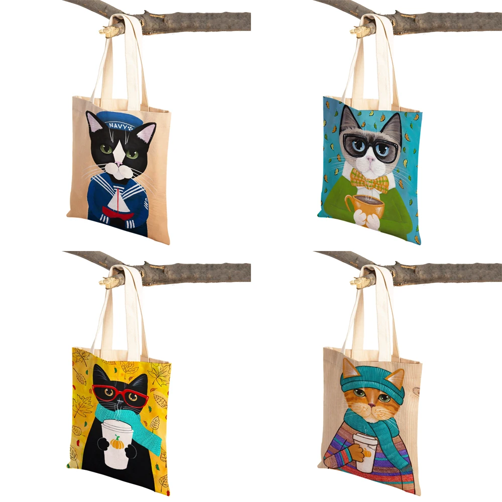 Модная женская сумка-тоут с изображением кофейного кота из мультфильма, тканевая складная сумка с животным принтом, многоразовая женская сумка через плечо для покупок