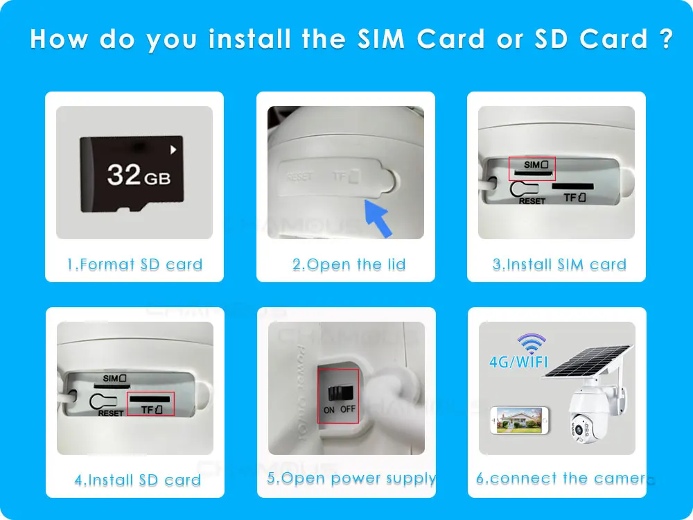 3. Как вставить sim-карту? Выключите солнечную камеру, вставьте sim-карту 4g, включите ip-камеру, а затем Сбросьте камеру безопасности.