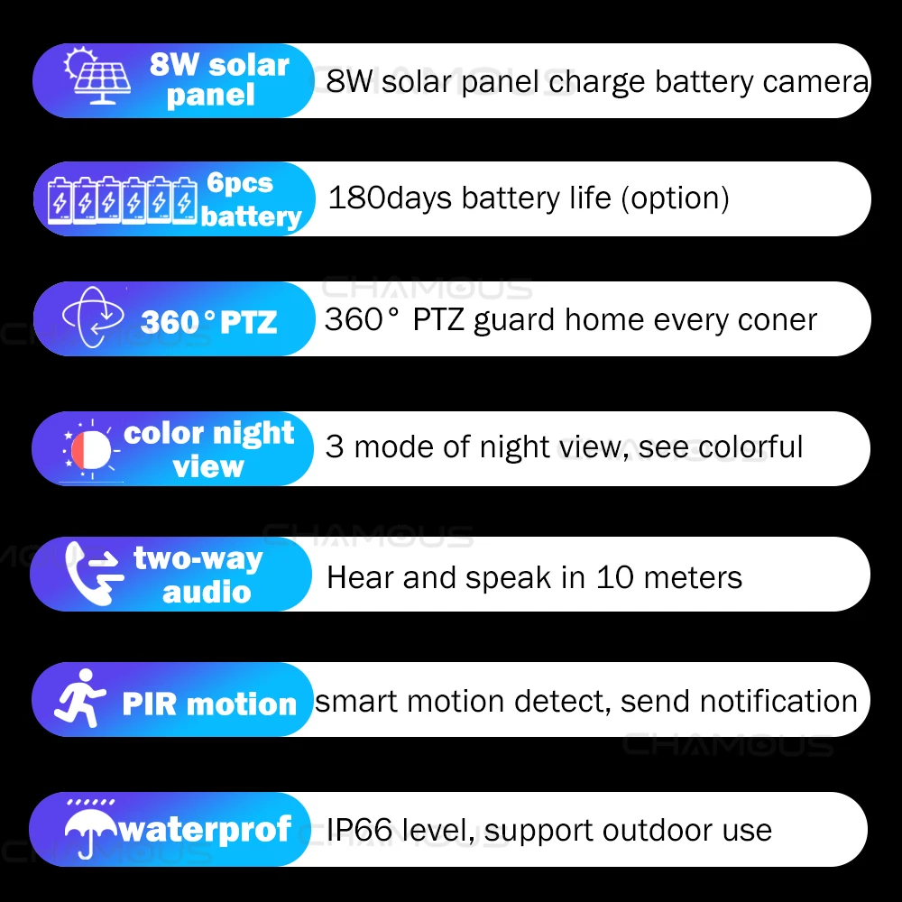 * Расширяемая камера на батарейках с 8 Вт солнечной панелью дает вам надежную и мощную беспроводную систему secirity camera во дворе.