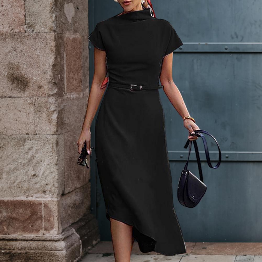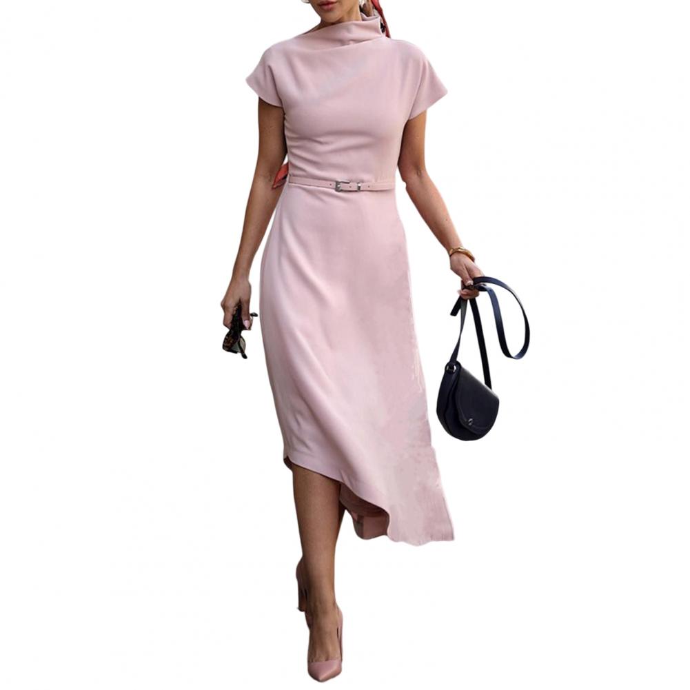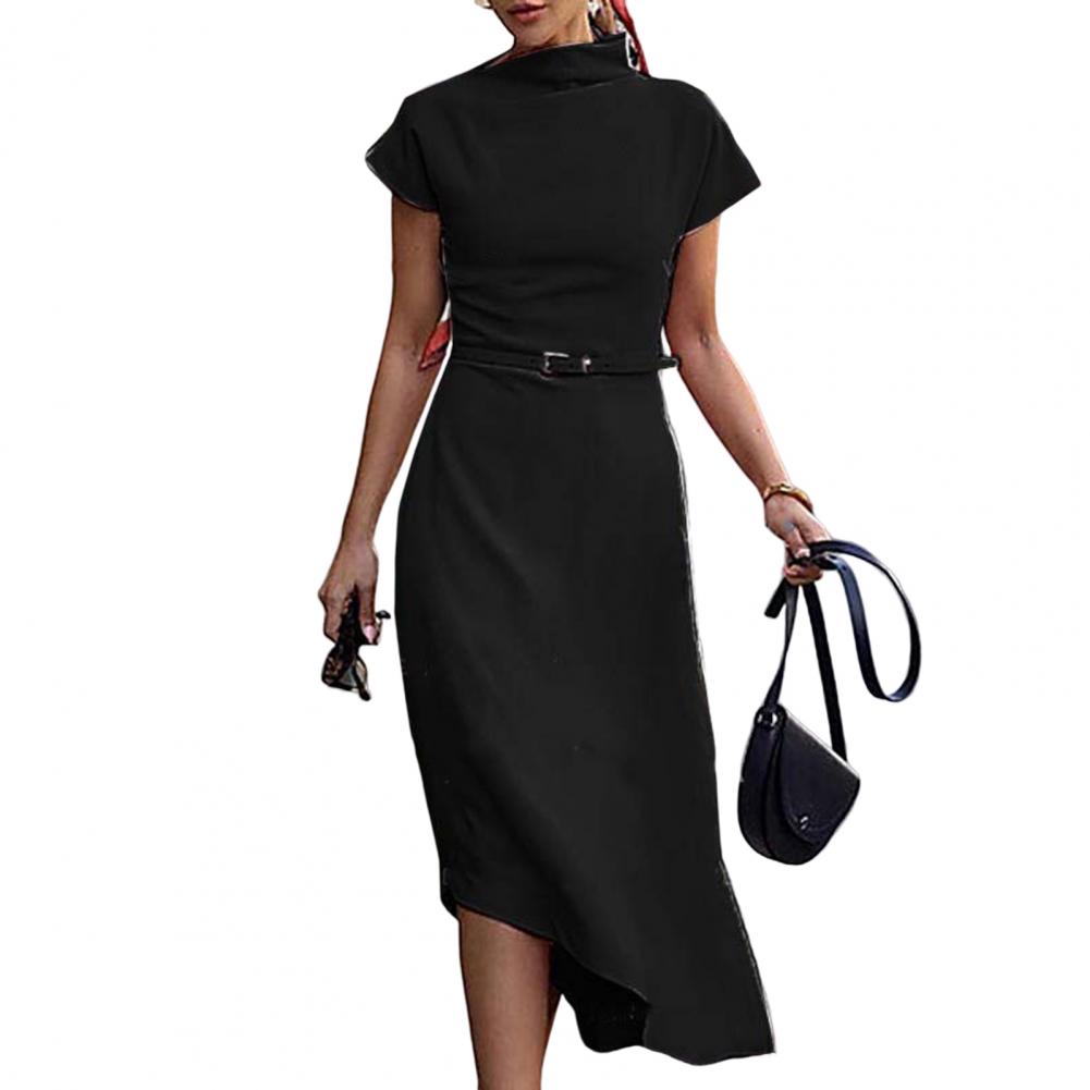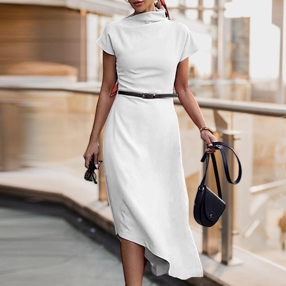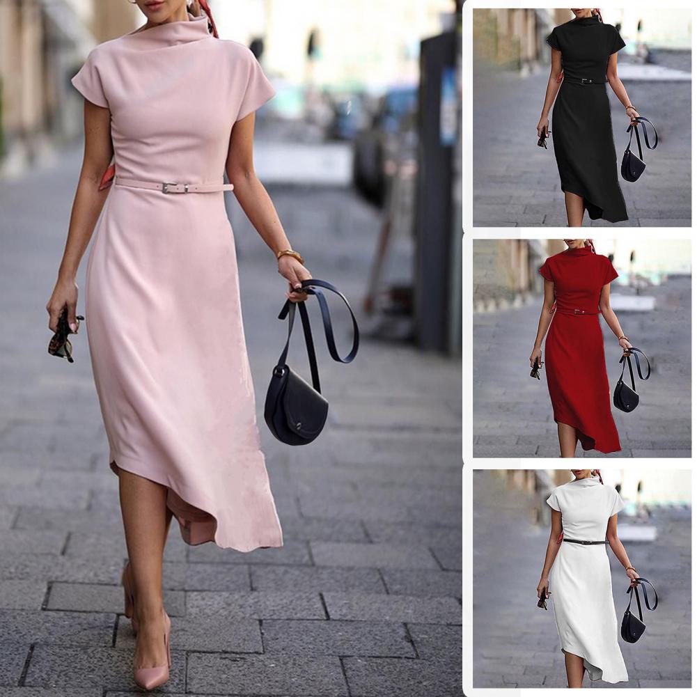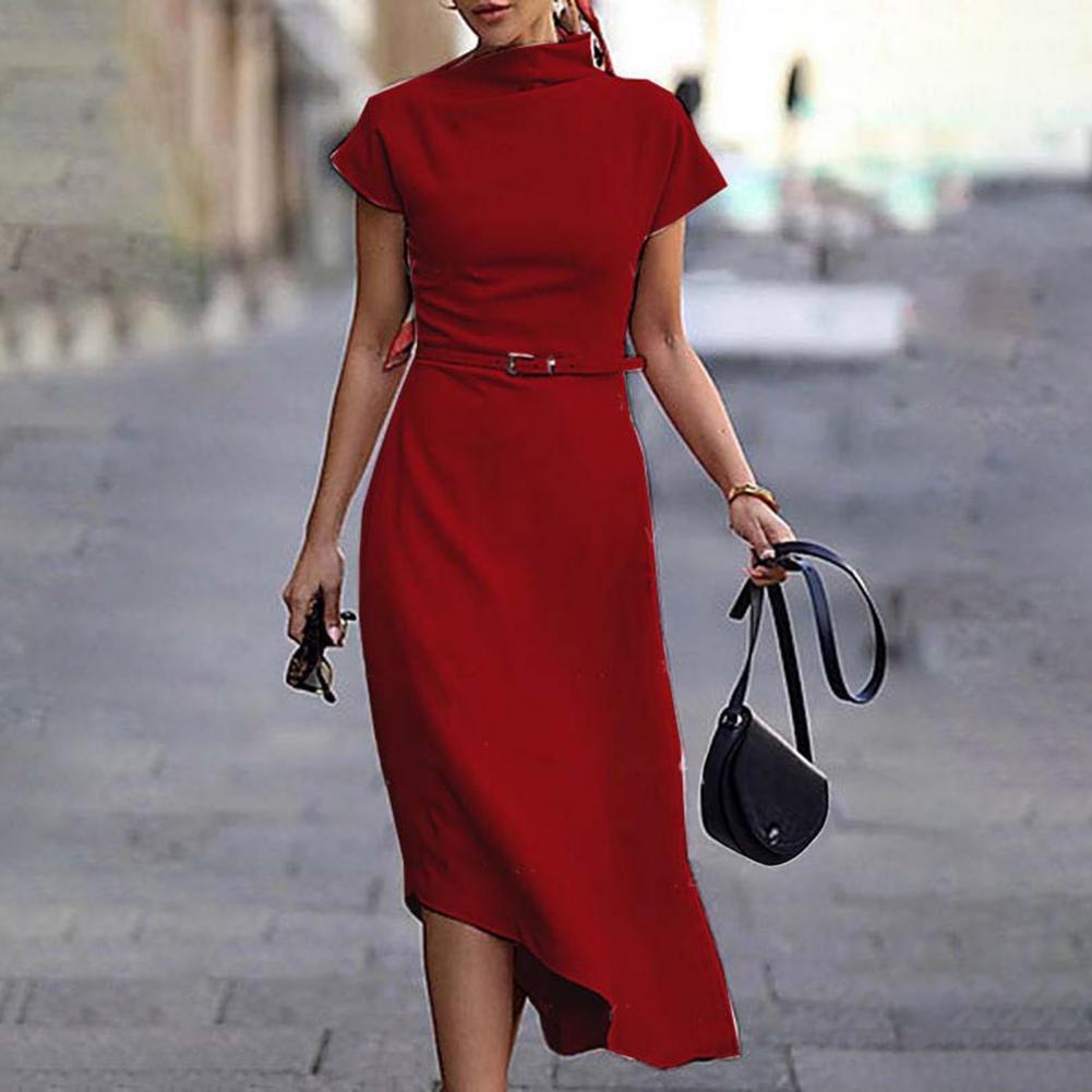 Женское платье, однотонное, с коротким рукавом, с высоким воротником, облегающая Талия, с косой каймой, офисное платье, женская одежда