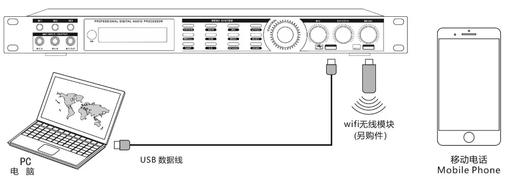 Аудиопроцессор x1Использование Manuel x 1Кабель питания x 1 (штепсельная вилка США или Европы)Wifi приемник x1Программное обеспечение x 1Пульт дистанционного управления x1Особенности