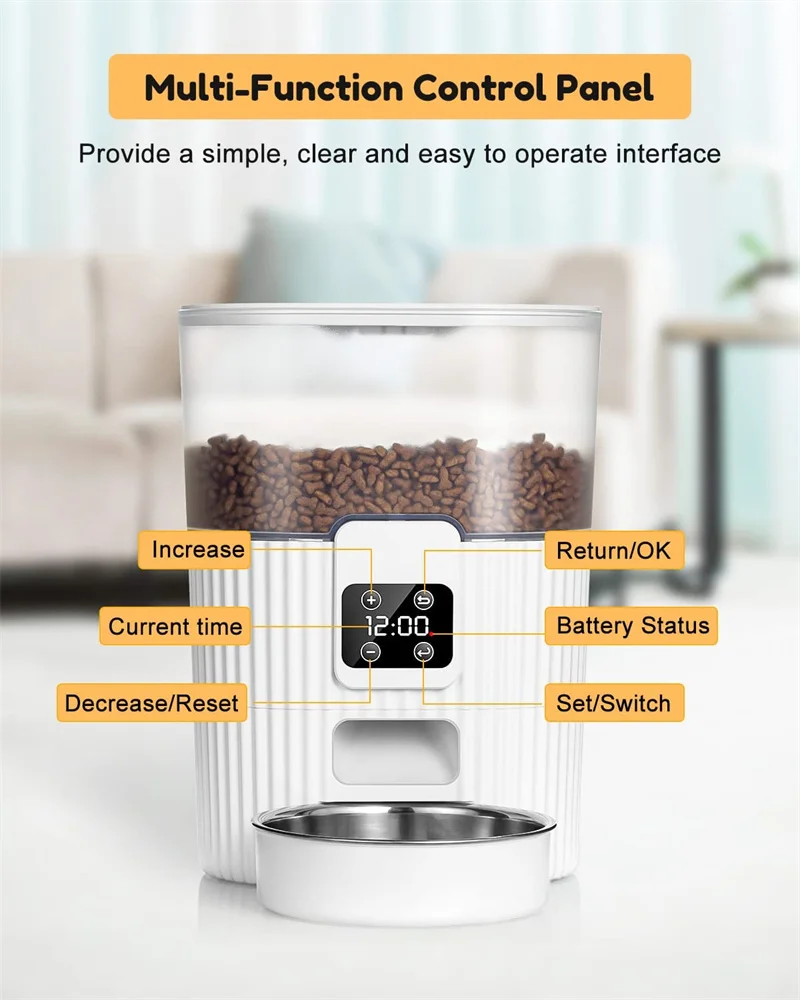 【Простота в эксплуатации interface】 самый простой интерфейс работы на рынке с 4 операционными кнопками. Вы можете установить ваш kitties' еды раз через 24-часовой формат времени система соотвествует пожеланиям заказчика, если выполняется в еды 01 была создана для 7:00, фидера обеспечит 01 еды в 7:00 с каждым днем. И вы можете настроить 1 ~ 6 блюд в день и 0 ~ 6 порций (10 ~ 15 г еды на порцию) сухой пищи на еду в зависимости от потребностей вашего питомца. Совет: корма размер будет идеально подходит в том случае, если между 0,19 ~ 0,39 дюйм (ов).