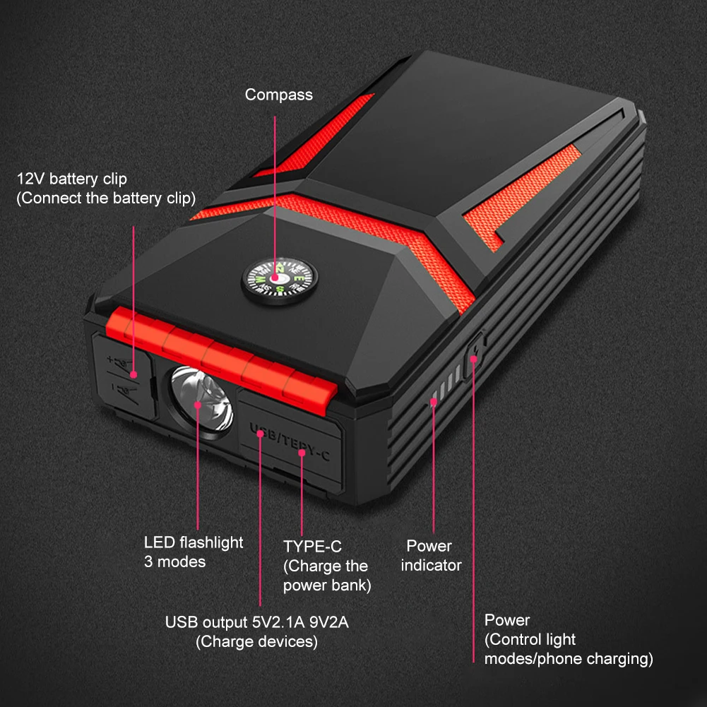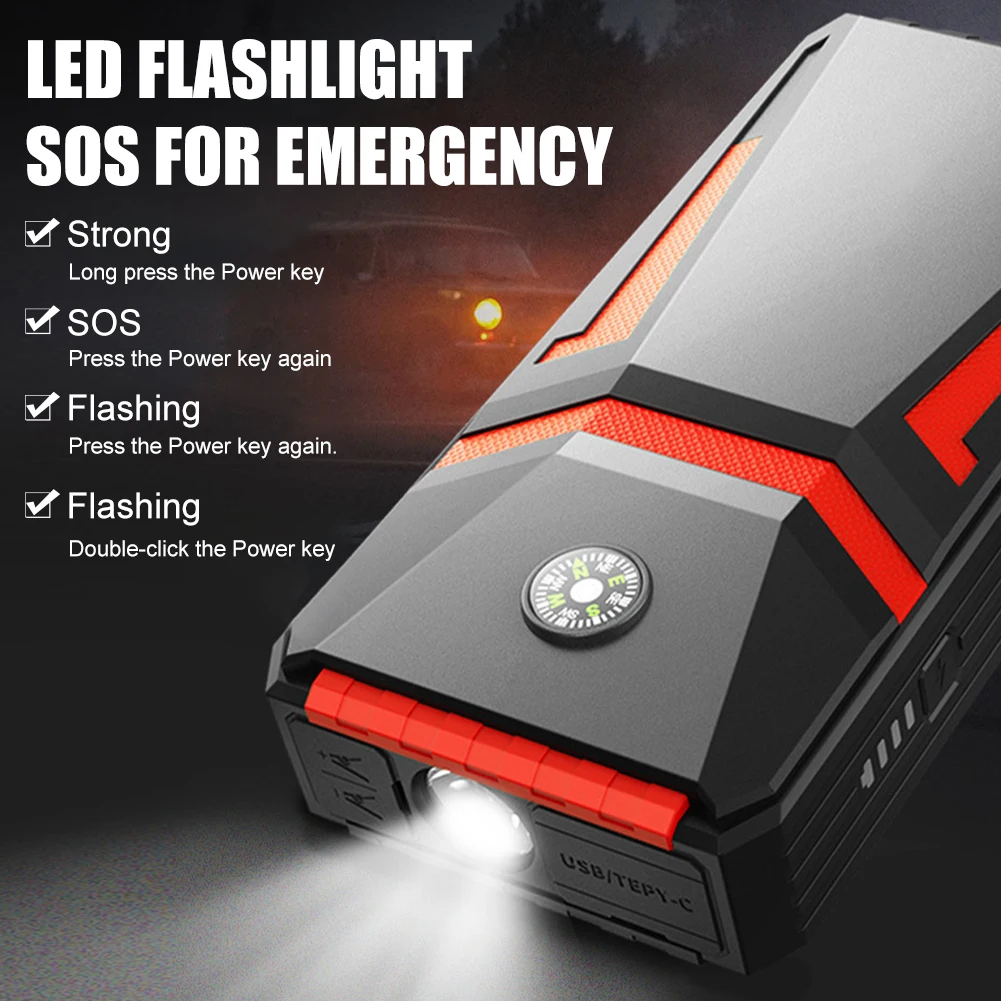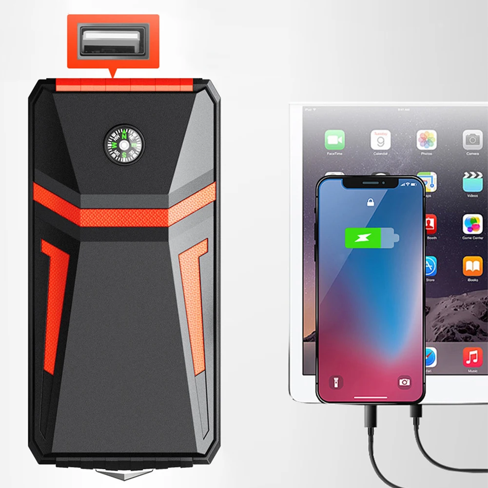 * 3. Многофункциональный стартер для автомобильного аккумулятора объединяет фонарик (3 режима освещения), внешний аккумулятор USB (5 В/2,1 А, 9 В/2 а), компас и оконный выключатель для чрезвычайных ситуаций.