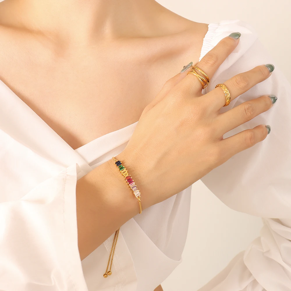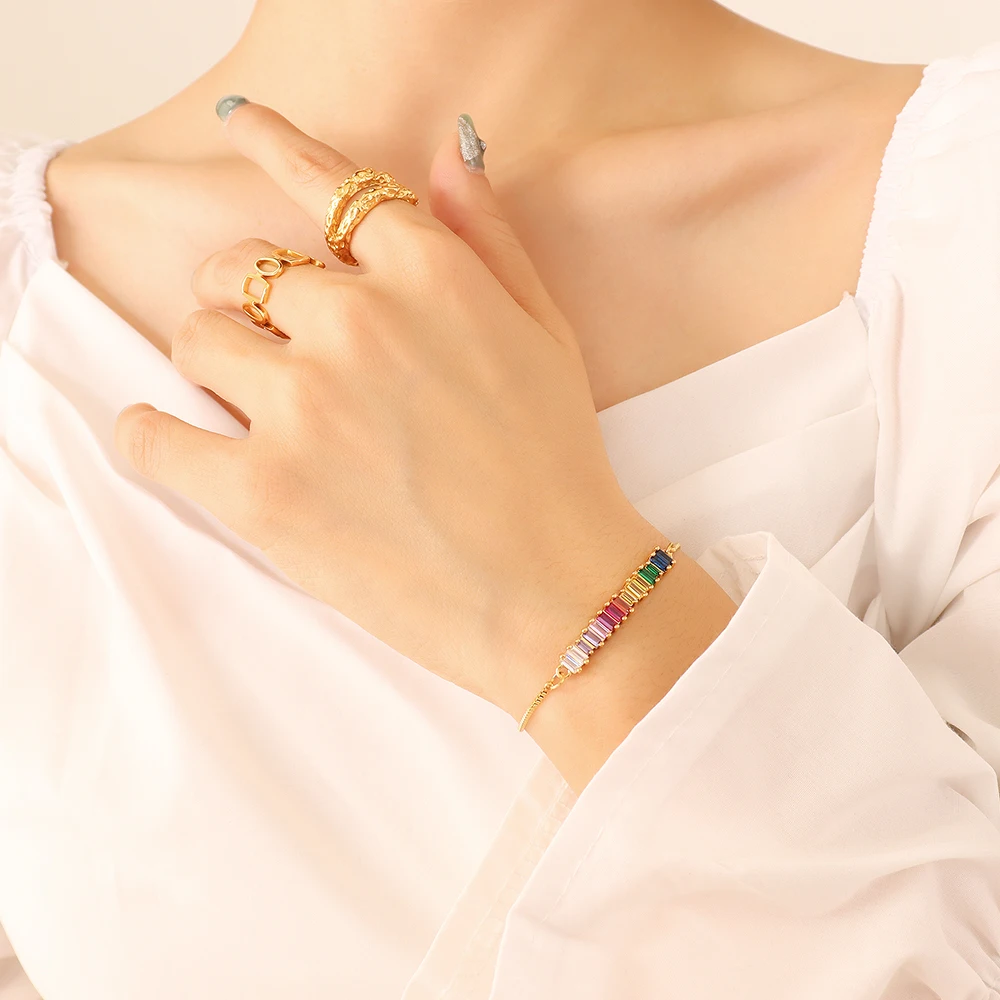 Luxury Rainbow Cubic Zirconia Chain Bangle Bracelet Stainless Steel Metal Waterproof Bracelet for Women Jewelry Gift