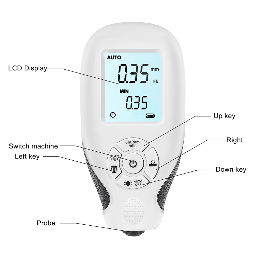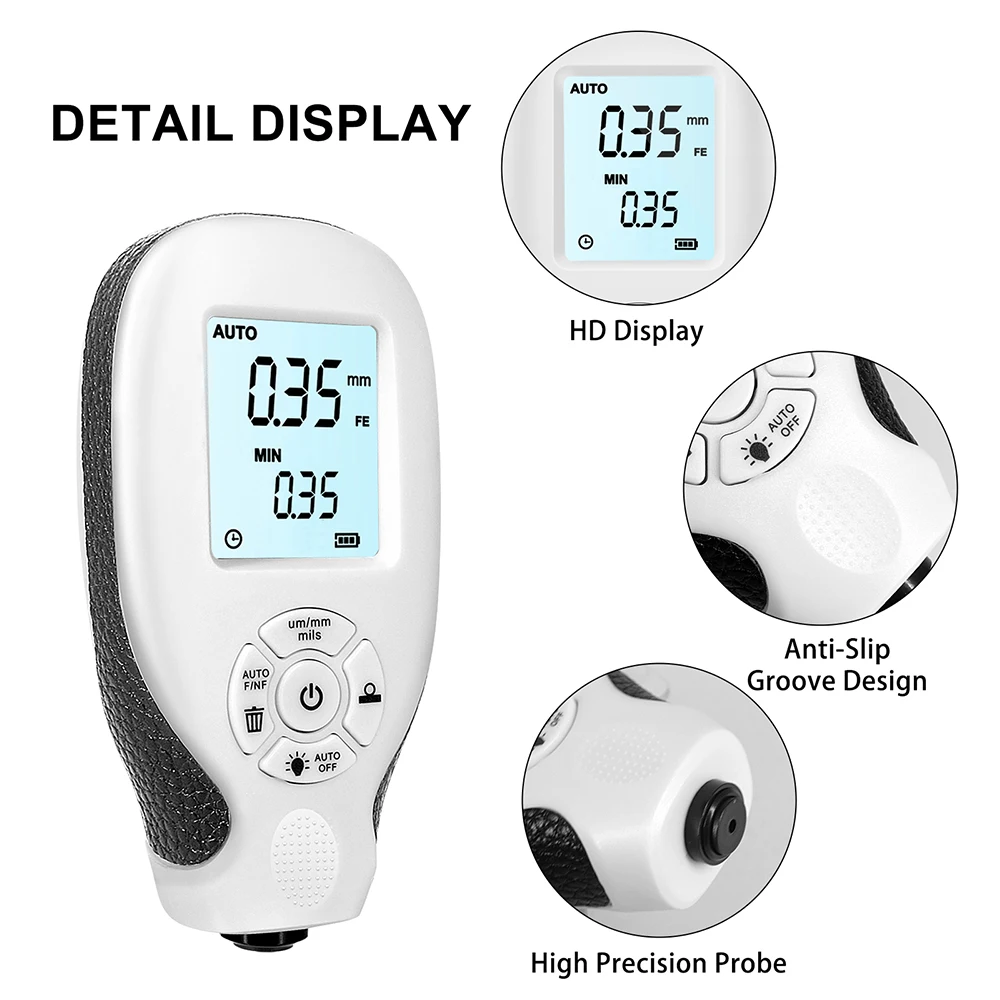 Цвет: белыйДиапазон измерения: от 0 до 78,74 mils (от 0 до 2000 μm)Точность: ± (3% показаний + 1 мкм) или ± (3% показаний + 0,039 мкм)Разрешение: 0,01 мм/1milКалибровка: простая и быстрая калибровка нулевой поверхностиСтатистики: количество показаний, среднее, минимальное, максимальное и стандартное отклонениеЕдиницы измерения: мкм, мм и милМощность питания: 2x1,5 V AAA батареи (Не прилагаются)Рабочая температура: от-10 ℃ до 50 ℃Размер: как показаноПосылка включает в себя:1 х толщиномер1 х Руководство5 x калибровочный лист