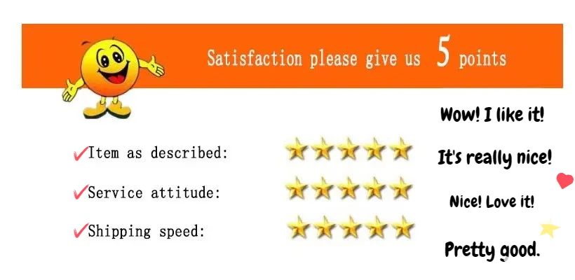 Отзывы очень важны для нас, мы стремимся к 100% удовлетворенности. И если вы удовлетворены нашей продукцией, пожалуйста, оставьте нам положительные отзывы и дайте нам 5 звезд, ваша Высокая рекомендация-это наша мотивация, мы ценим ваше время для положительных отзывы.