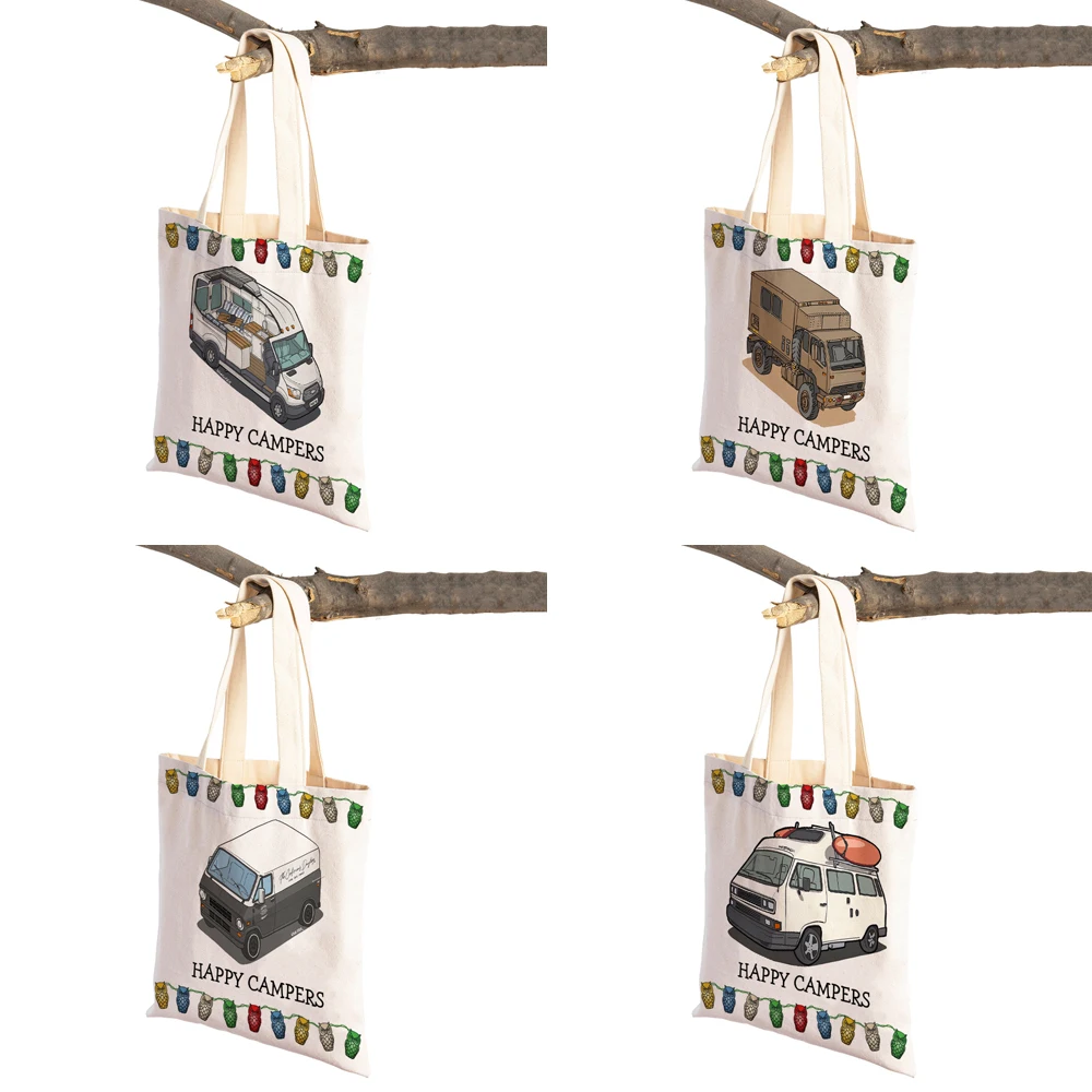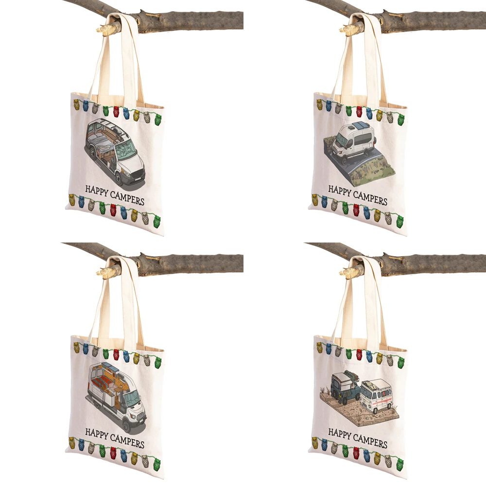Женская сумка-тоут с принтом в виде мультипликационного домика для путешествий, Повседневная сумка с двойным принтом Happy Camper Van Life, модная женская Холщовая Сумка для покупок