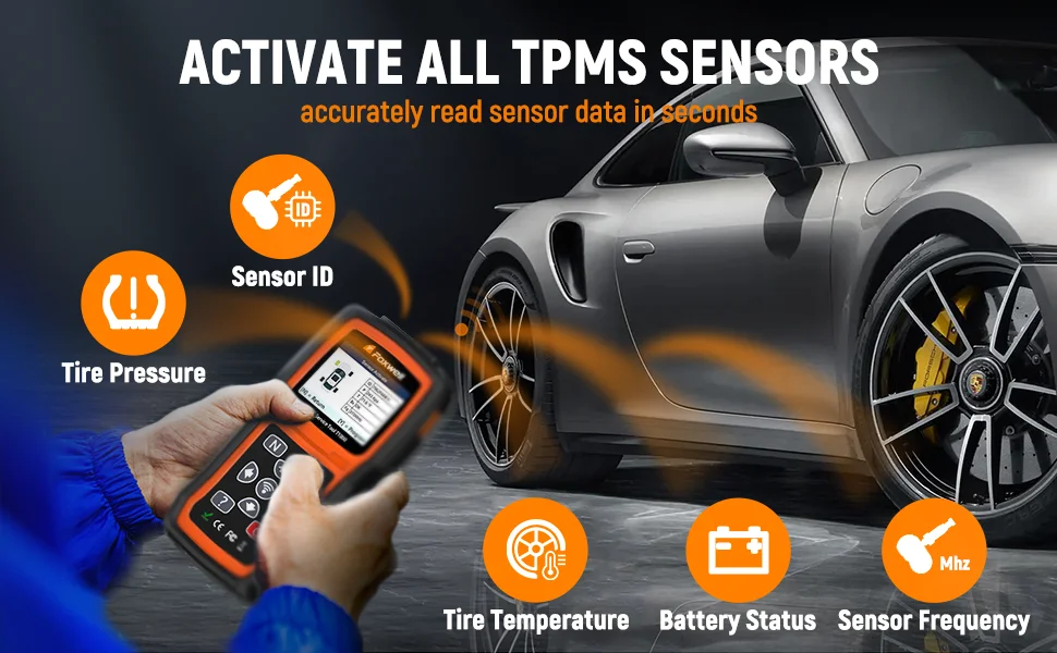 Почему включен светильник TPMS? Погода, если давление воздуха в шинах слишком низкое? Или сенсорная батарея слишком слаба? Диагностический инструмент FOXWELL T1000 TPMS может считывать идентификационный номер датчика, давление в шинах, температуру в шинах, сенсорную батарею и частоту за считанные секунды, помогает быстро разобраться со всеми проблемами TPMS.