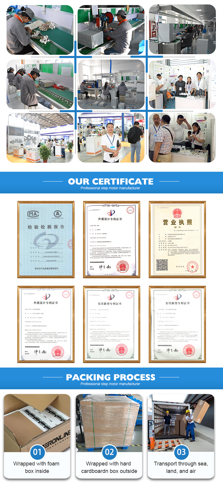 Наша команда имеет более 10 лет дизайна шагового двигателя, разработки и производственного опыта, поэтому мы можем достичь разработки продукта и вспомогательной конструкции в соответствии с особыми потребностями клиентов!