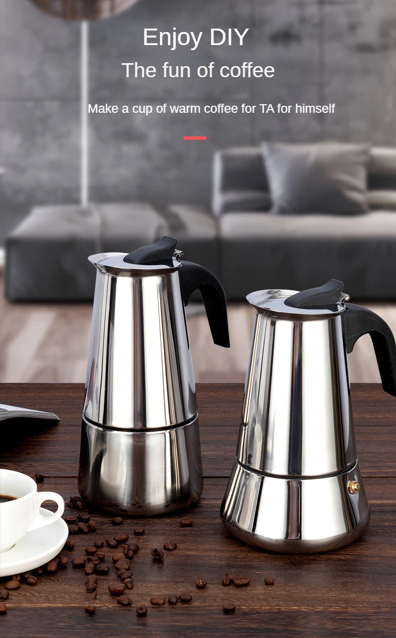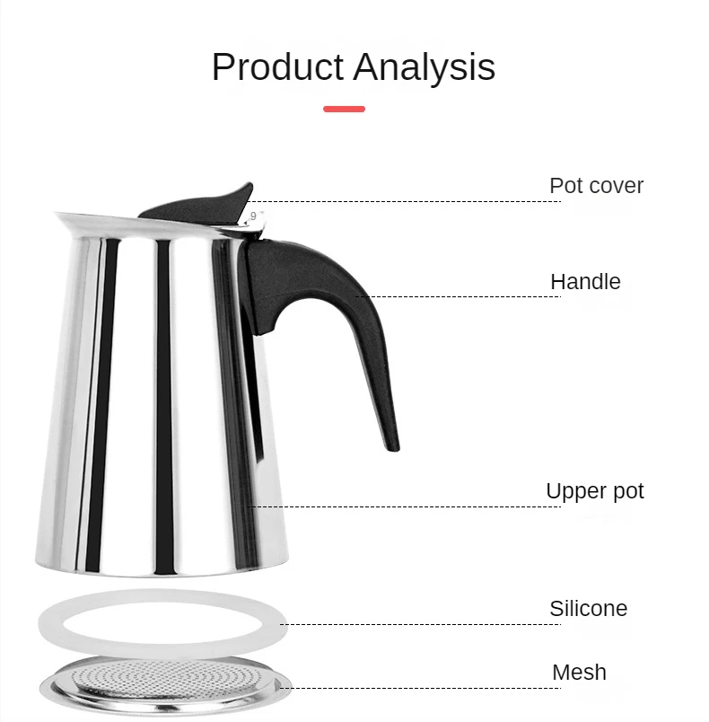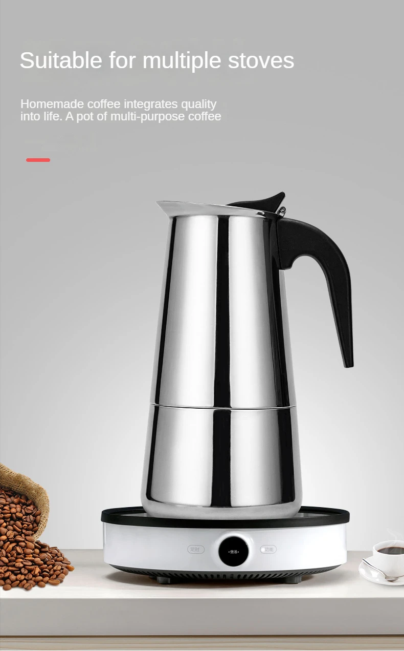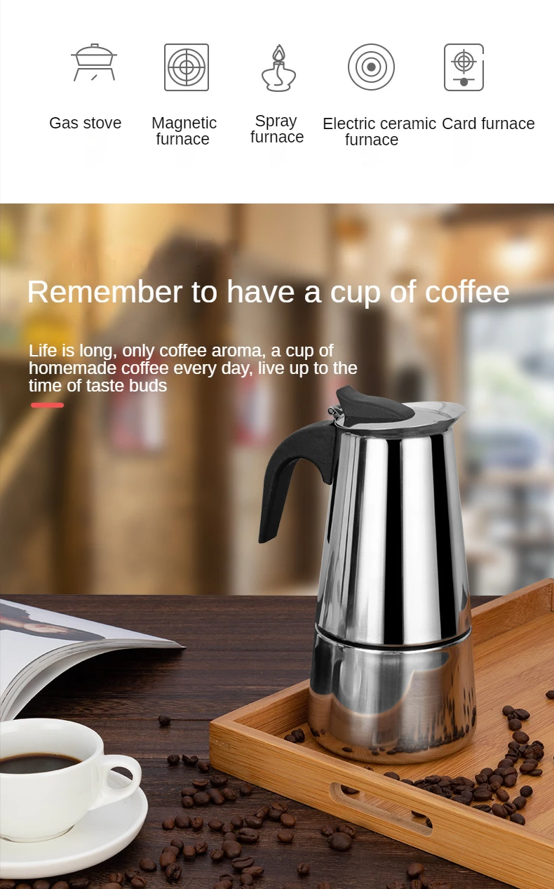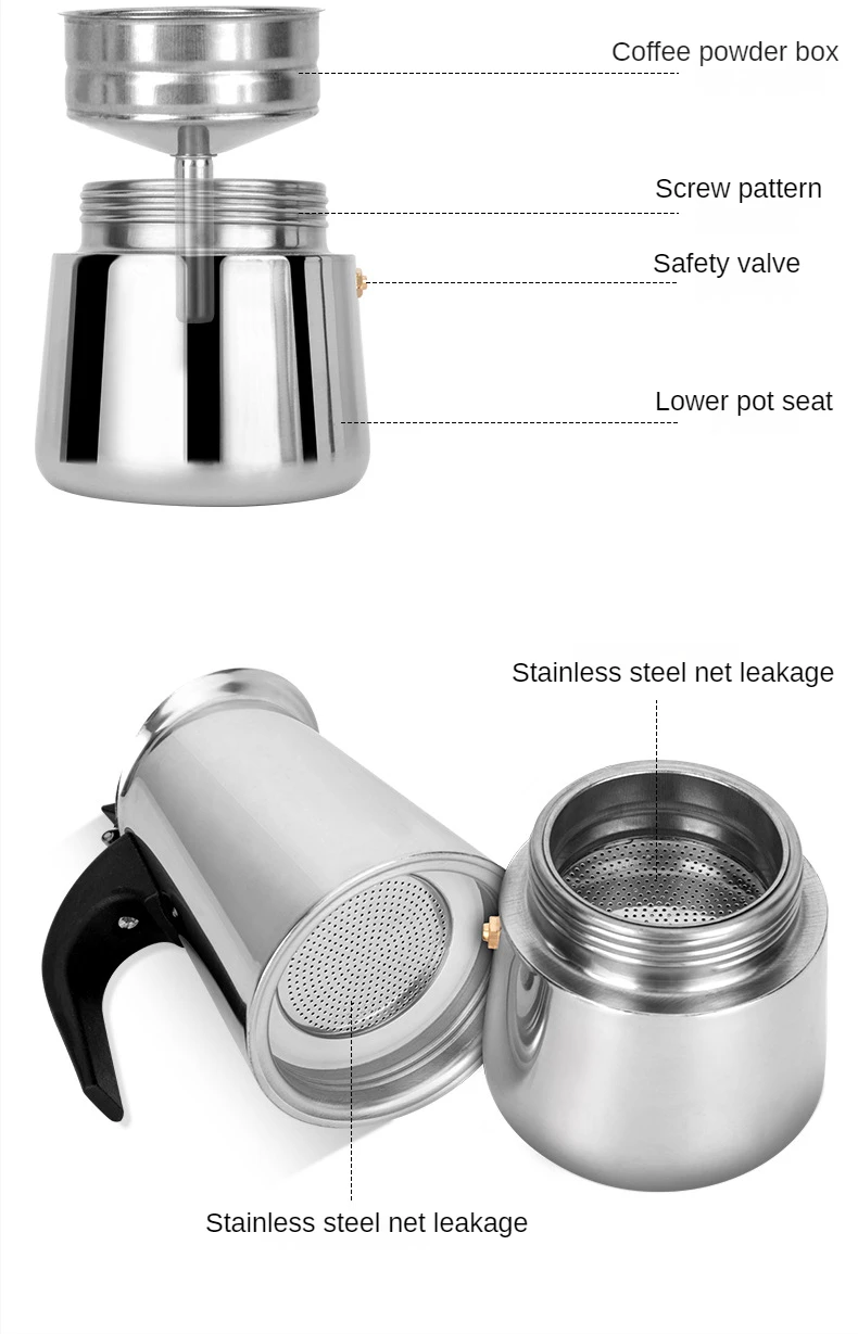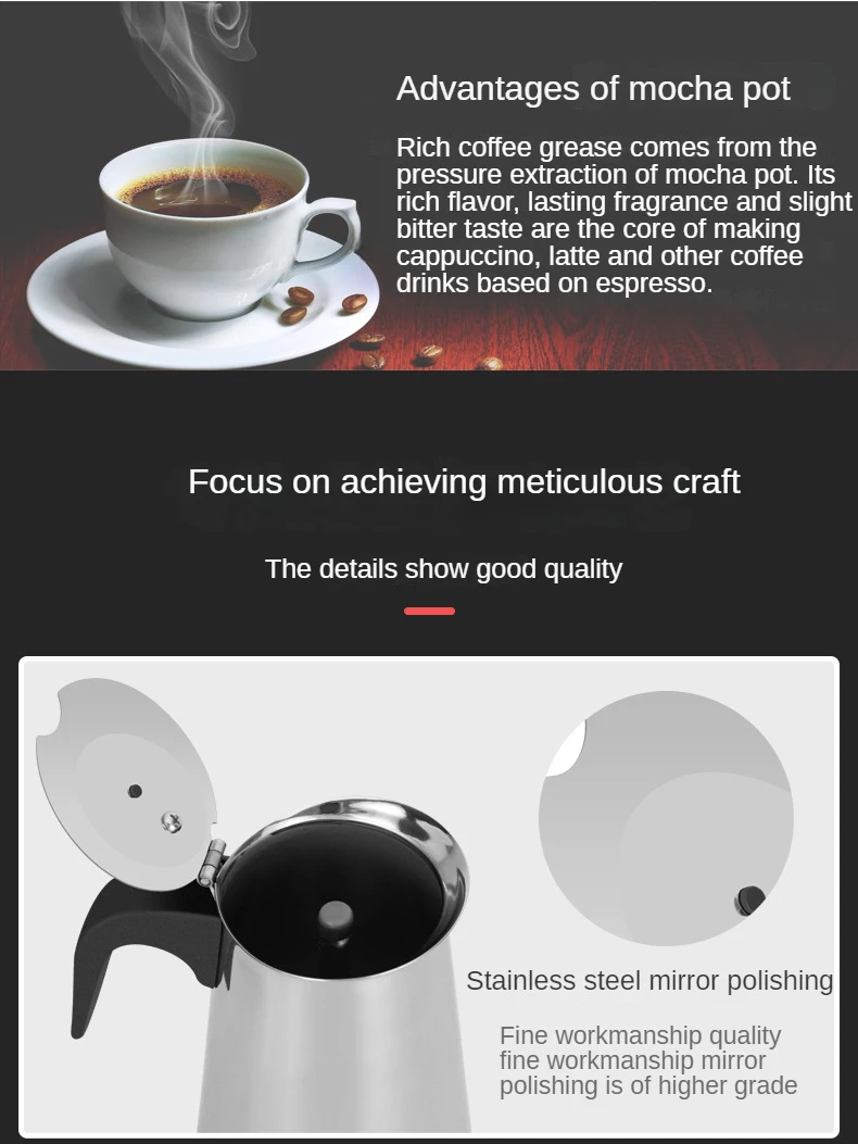 2. Эспрессо сделано из пищевой безопасной нержавеющей стали, подходит для различных печей, включая индукционную плиту, электрическую печь, керамическую печь, спиртовую печь и газовую плиту. Из-за отличной коррозии и стойкости к ржавчине, его также можно очистить с помощью посудомоечной машины.