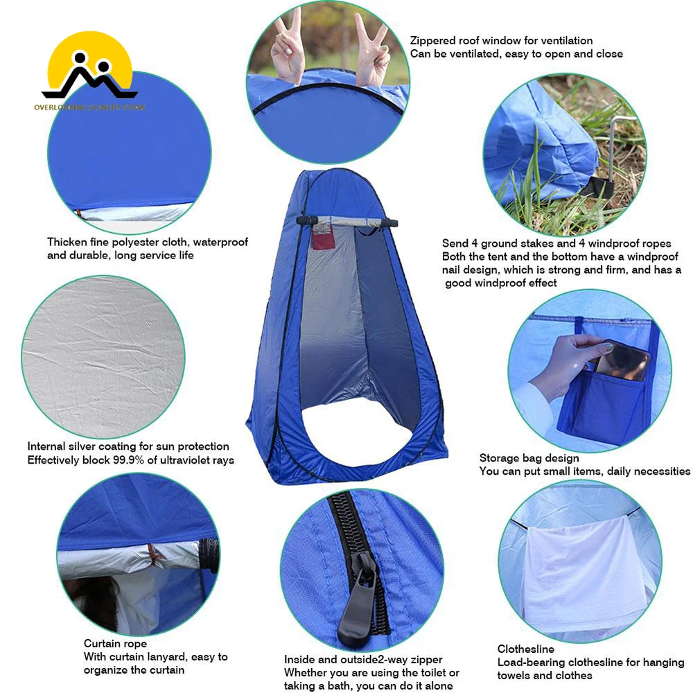 1. Широкий спектр применения: портативные палатки идеально подходят для использования в качестве наружных туалетов, душевых палаток для смены, кемпинга, рыболовных укрытий. Это идеальное укрытие для открытого воздуха, пляжа, леса, путешествий, игр, вечеринок, выступлений. Закрытая крыша обеспечивает конфиденциальность.