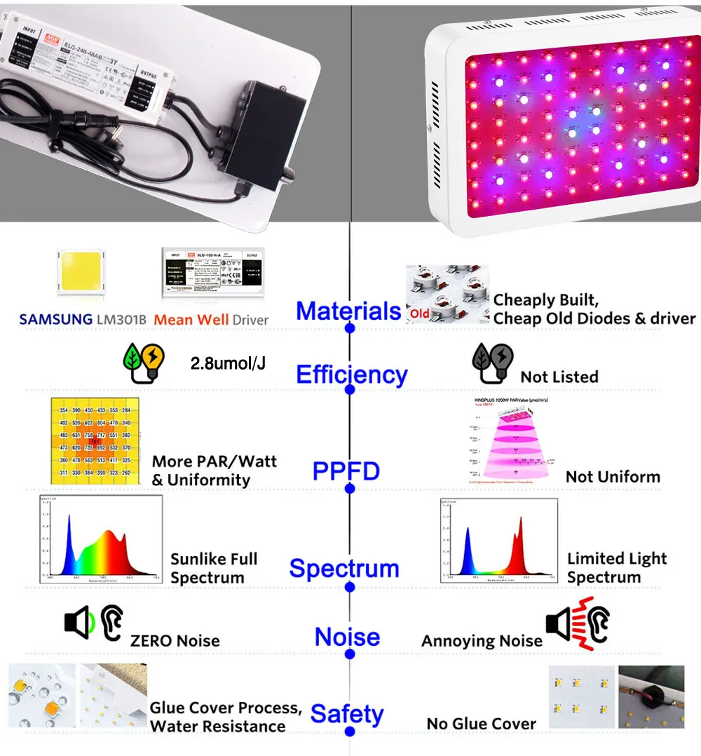 Чипы: Samsung LM301B/LM301H чипов (3000K,5000K)+ (660nm, ИК, УФ);