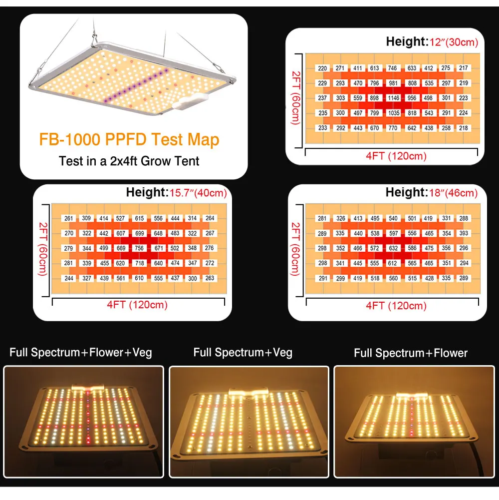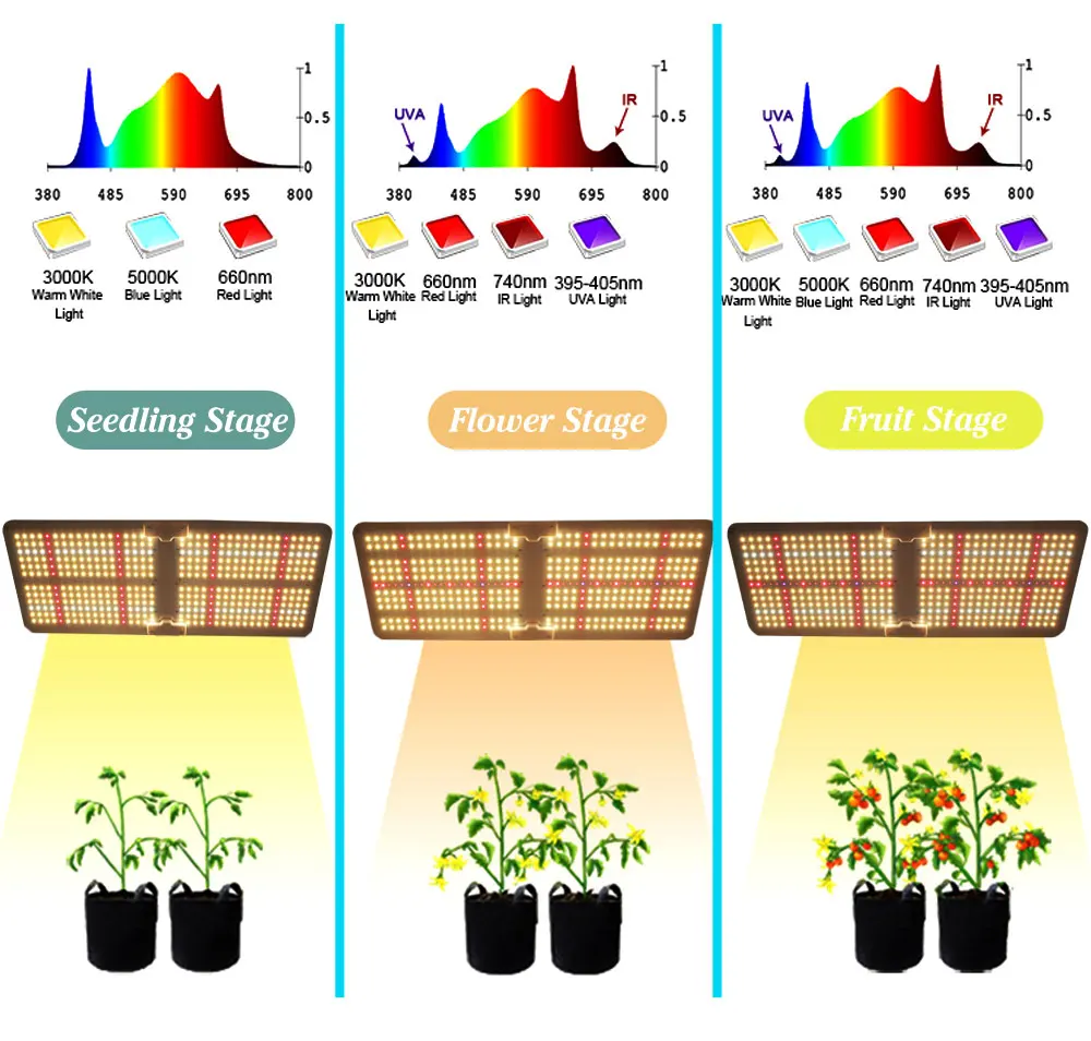 Полный спектр: 430 ~ 440nm, 450 ~ 475nm, 620 ~ 630nm, 650 ~ 660nm,3500K и 6000k, ИК 730nm, УФ 410nm;