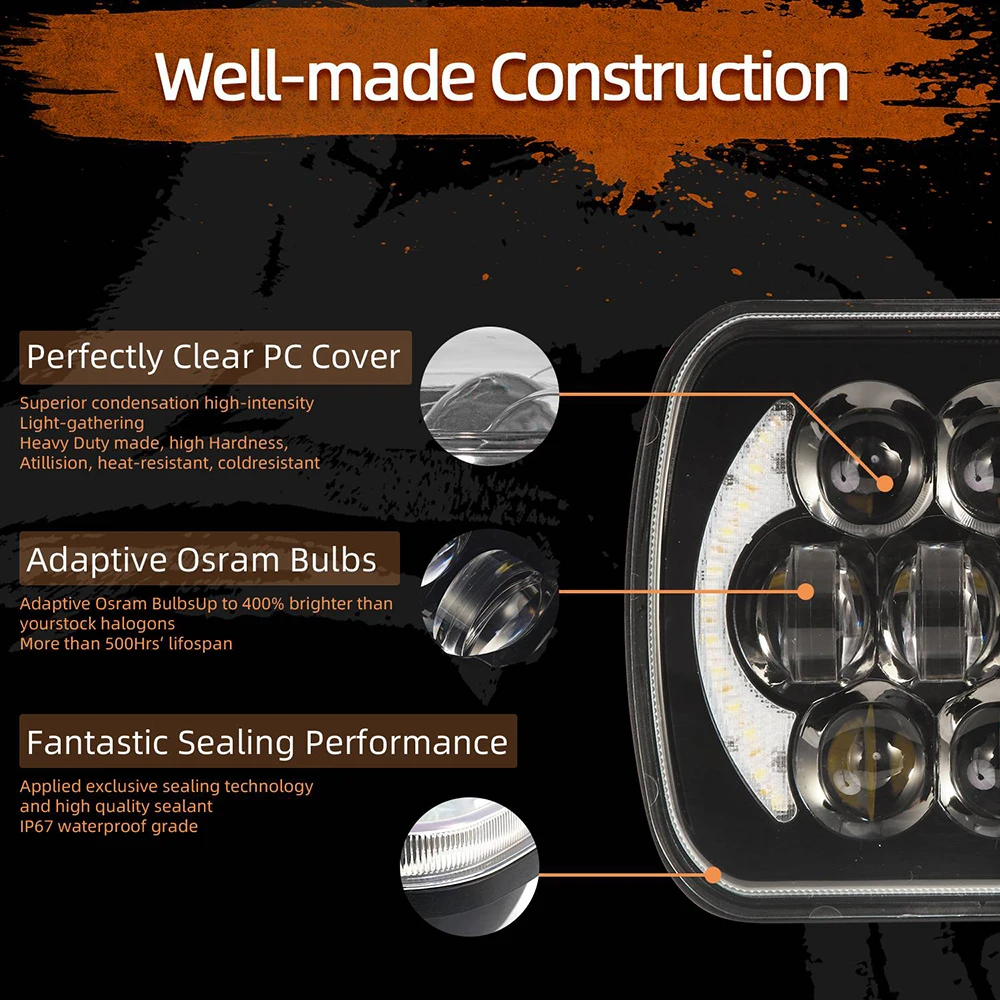 Функция: дальний/ближний свет + DRL; Размер: 5x7 дюймов/7x6 дюймов; Световой поток: 20800LM @ дальний свет, 10800LM @ ближний свет; Рабочее напряжение: 9-80 В постоянного тока; Водонепроницаемость: IP 68; Высокая интенсивность Osram CSP светодиодов