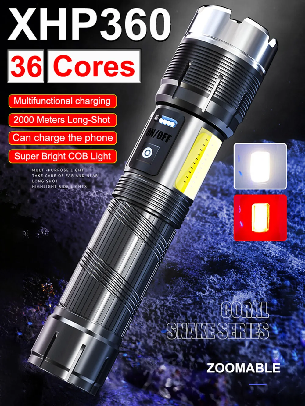 Фонарик XHP360 принимает телескопическую фокусировку, растягивая головку фонарика, чтобы открыть режим дальнего действия, а расстояние до 2000 м. Втягивание головки-это режим прожектора ближнего и дальнего действия.