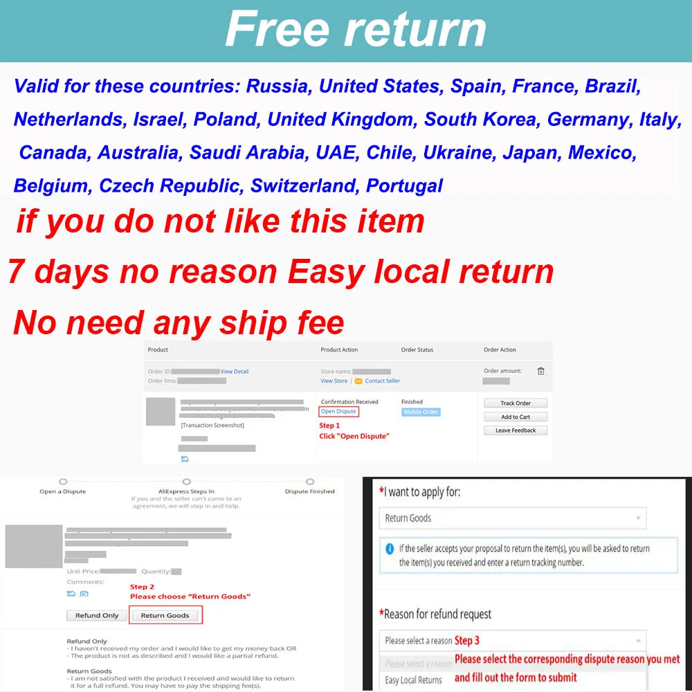 Товар является поддержкой бесплатного возврата для большинства стран, если вам это не нравится, пожалуйста, откройте диспут бесплатного возврата, выбрав причину: покупатель не хочет этот товар. Возврат Бесплатный, и возврат полностью.
