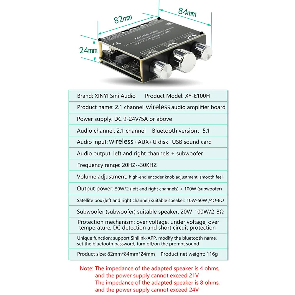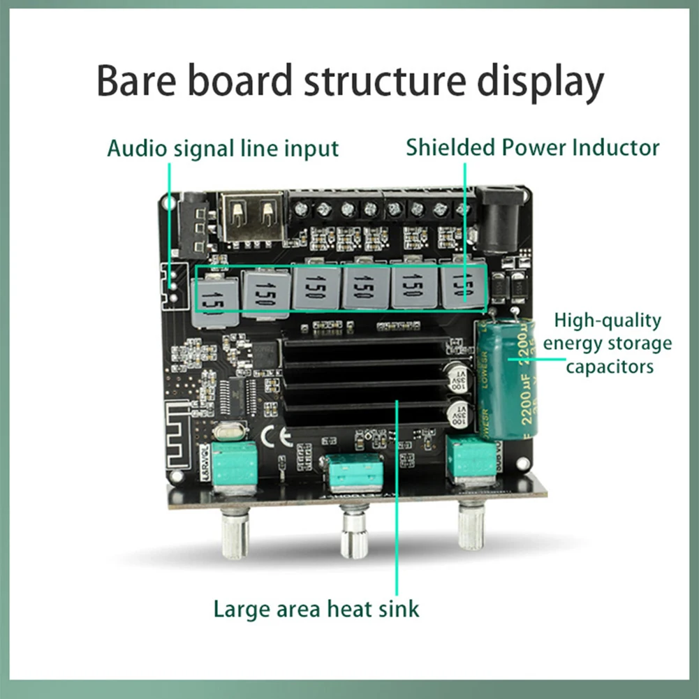 2. Bluetooth-совместимый 5.1 модуль усилителя мощности звука: 2,1 двухканальный стереовыход, максимальная выходная мощность 2X50 Вт, с предварительной настройкой высокой и низкой частоты; Чистое качество звука Hi-Fi. Высокие частоты чистые и прозрачные, средние частоты мягкие и нежные, а басы ярко и потрясающе.