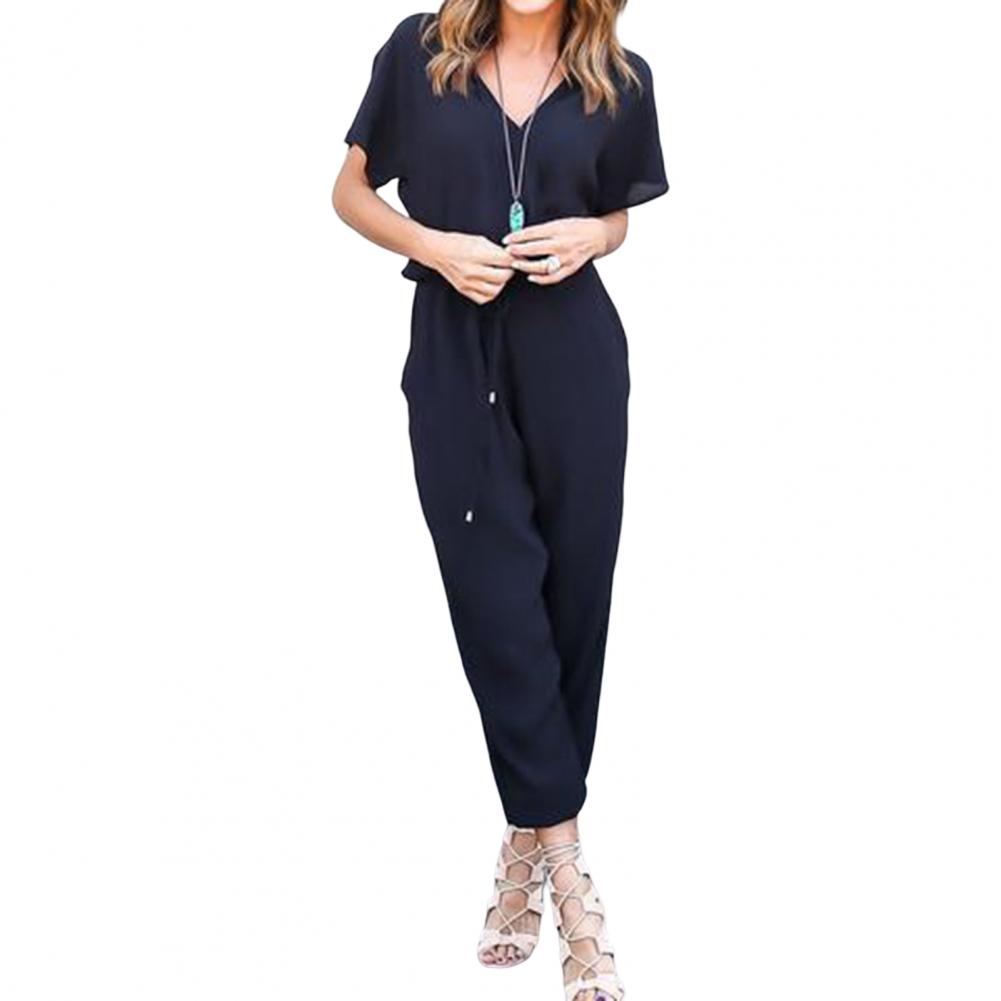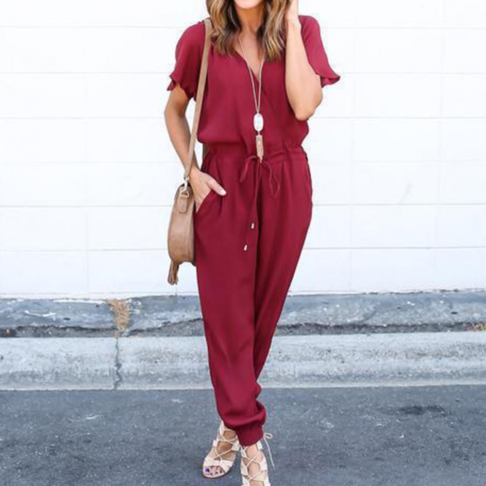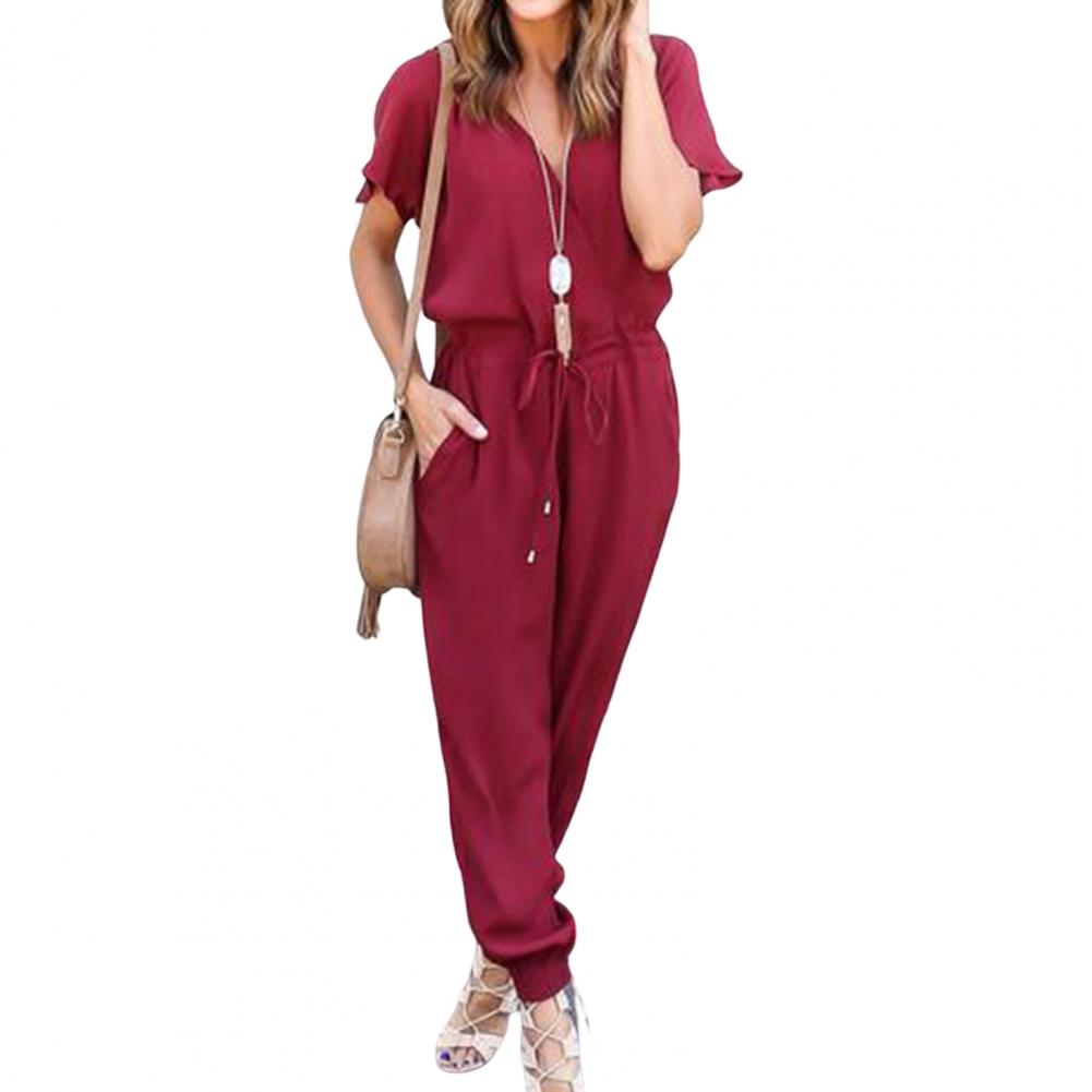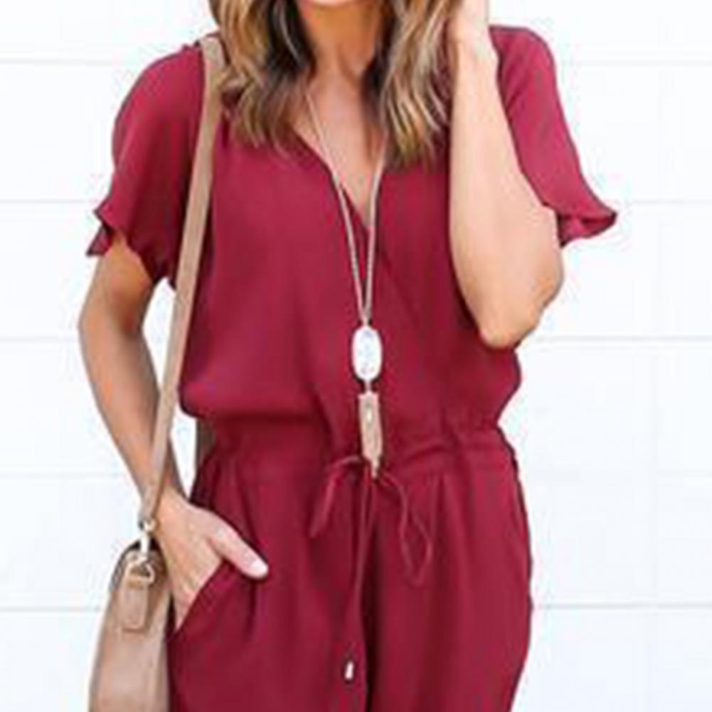 Женский комбинезон, сплошной цвет, глубокий v-образный вырез, эластичная резинка на талии, короткий рукав, Летний комбинезон, повседневная одежда