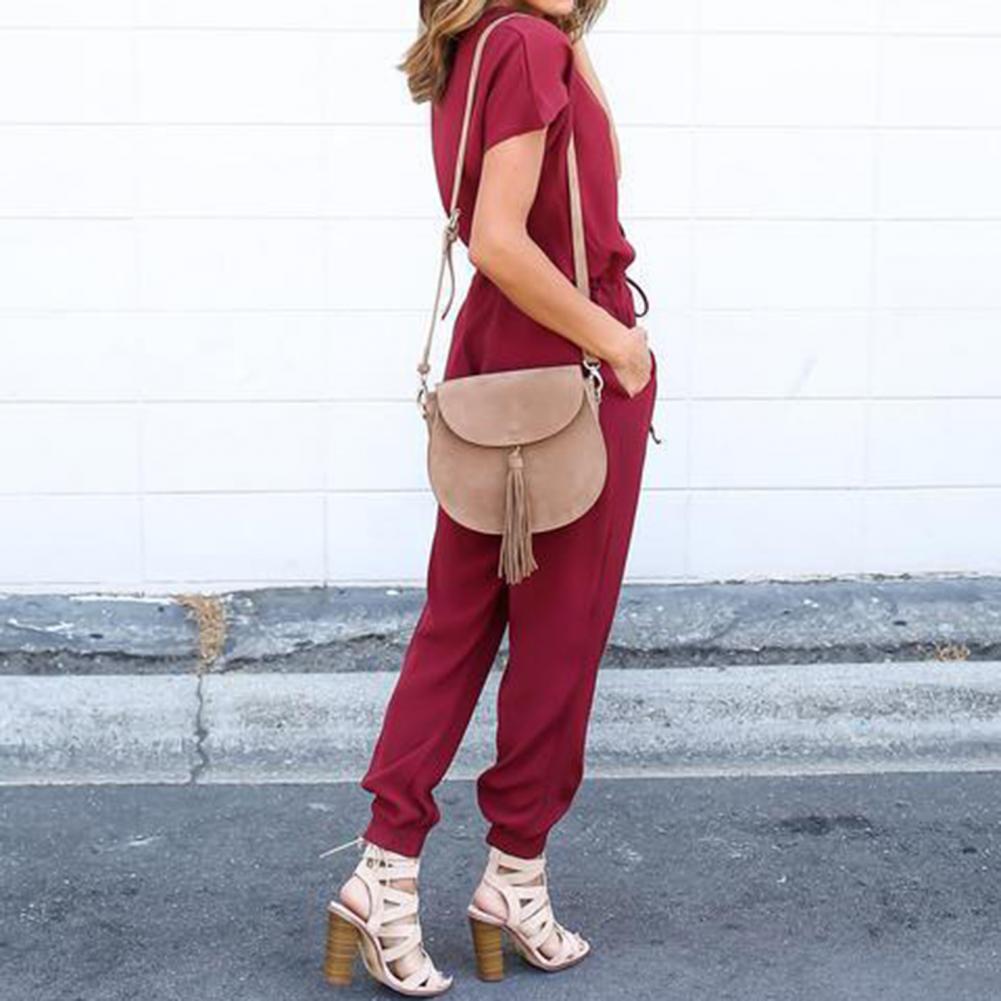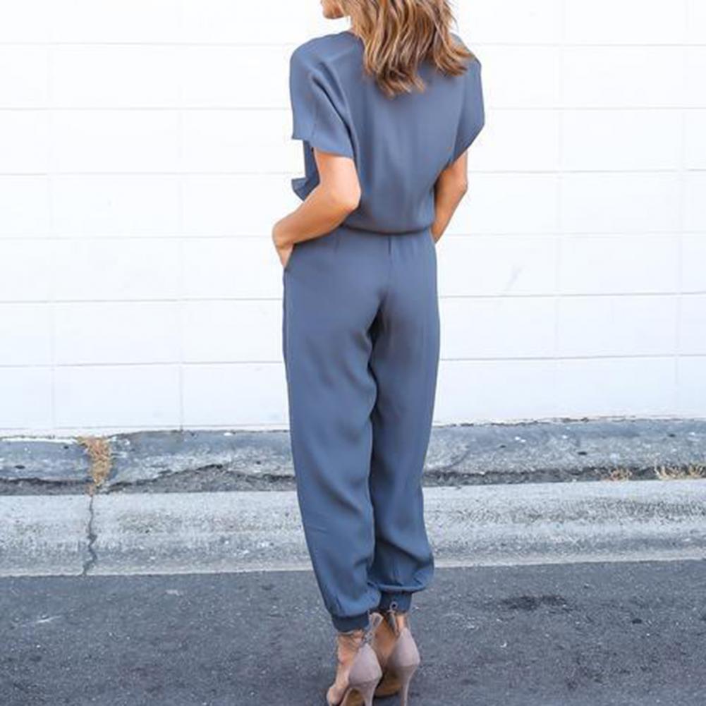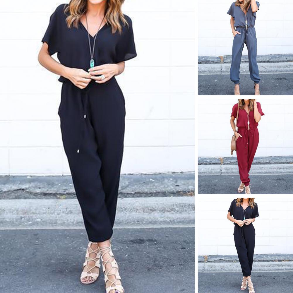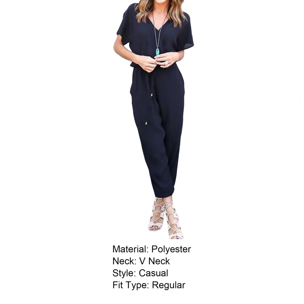 Женский комбинезон, сплошной цвет, глубокий v-образный вырез, эластичная резинка на талии, короткий рукав, Летний комбинезон, повседневная одежда