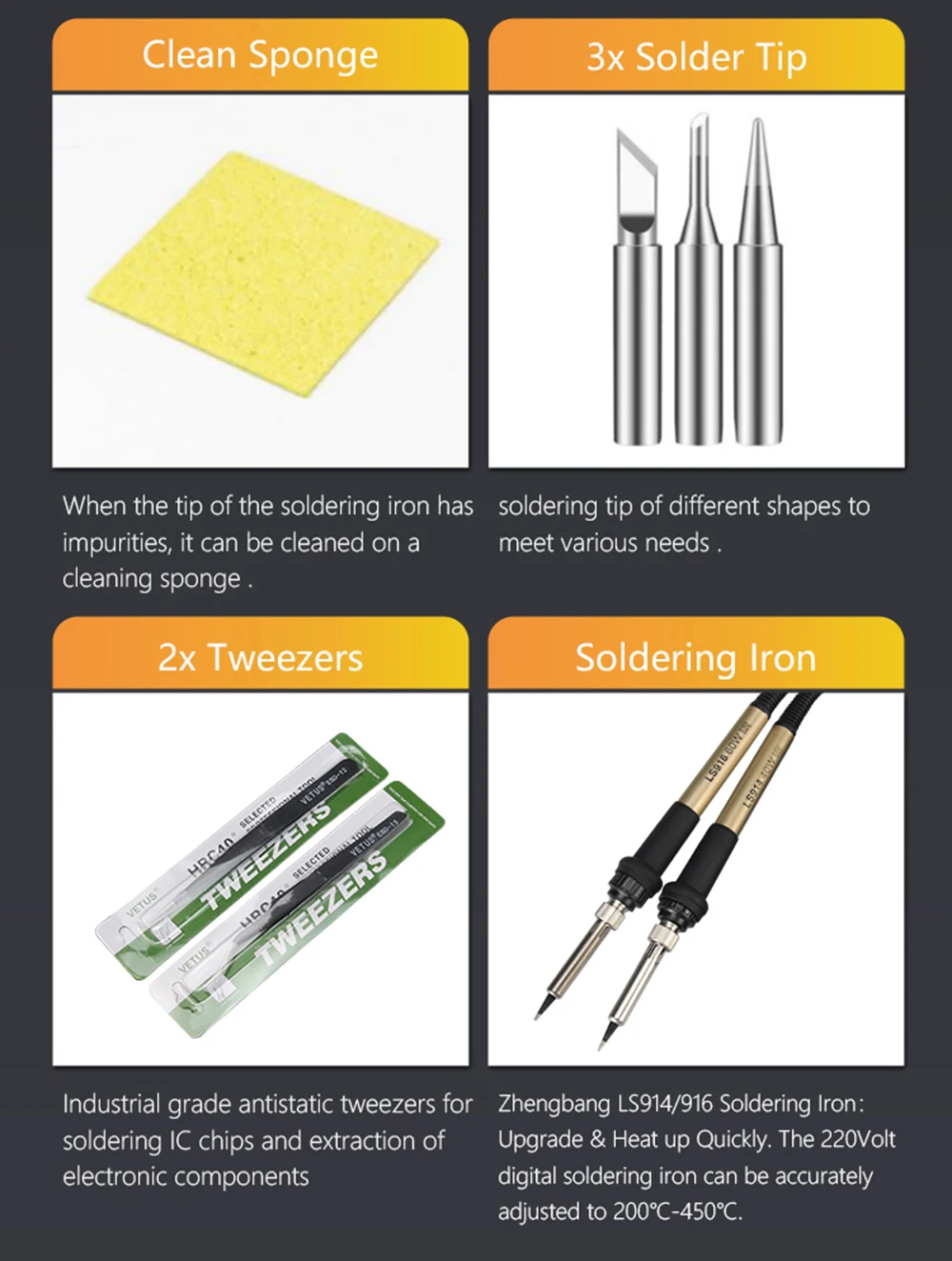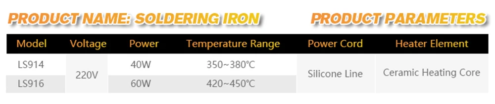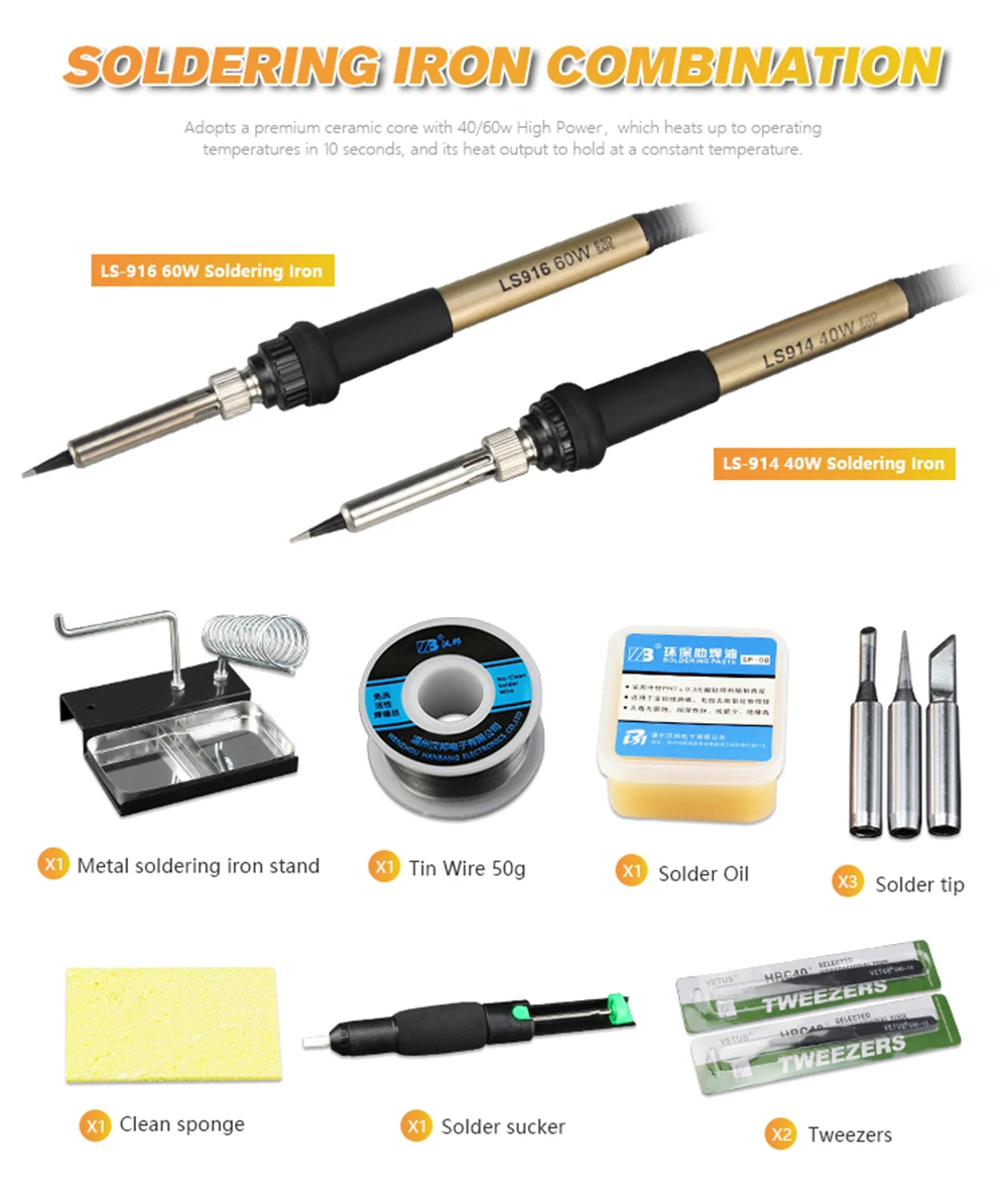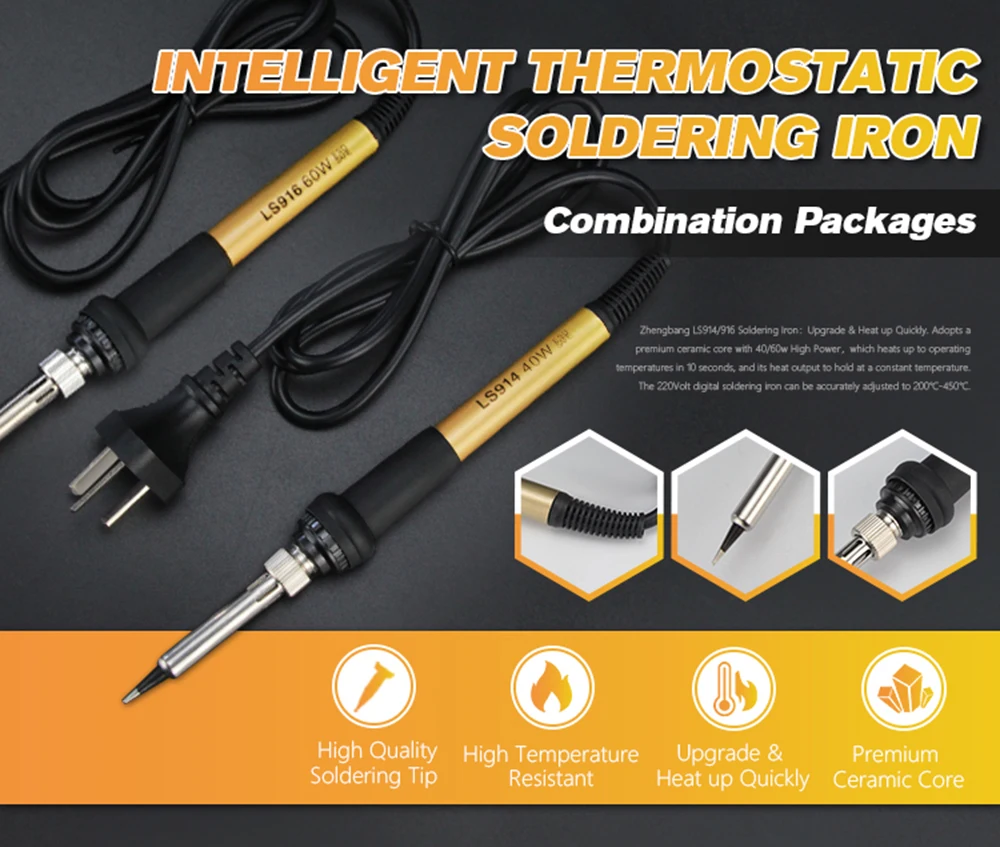 Паяльник Zhengbang LS916: быстро обновляется и нагревается, Восстановленный никель-хромовый нагревательный сердечник, безопасный и стабильный, длительный срок службы. Высокая мощность 60 Вт, которая нагревается до рабочих температур в течение 10 секунд, и ее тепловая мощность удерживается при постоянной температуре. Рабочее напряжение 200-240 В