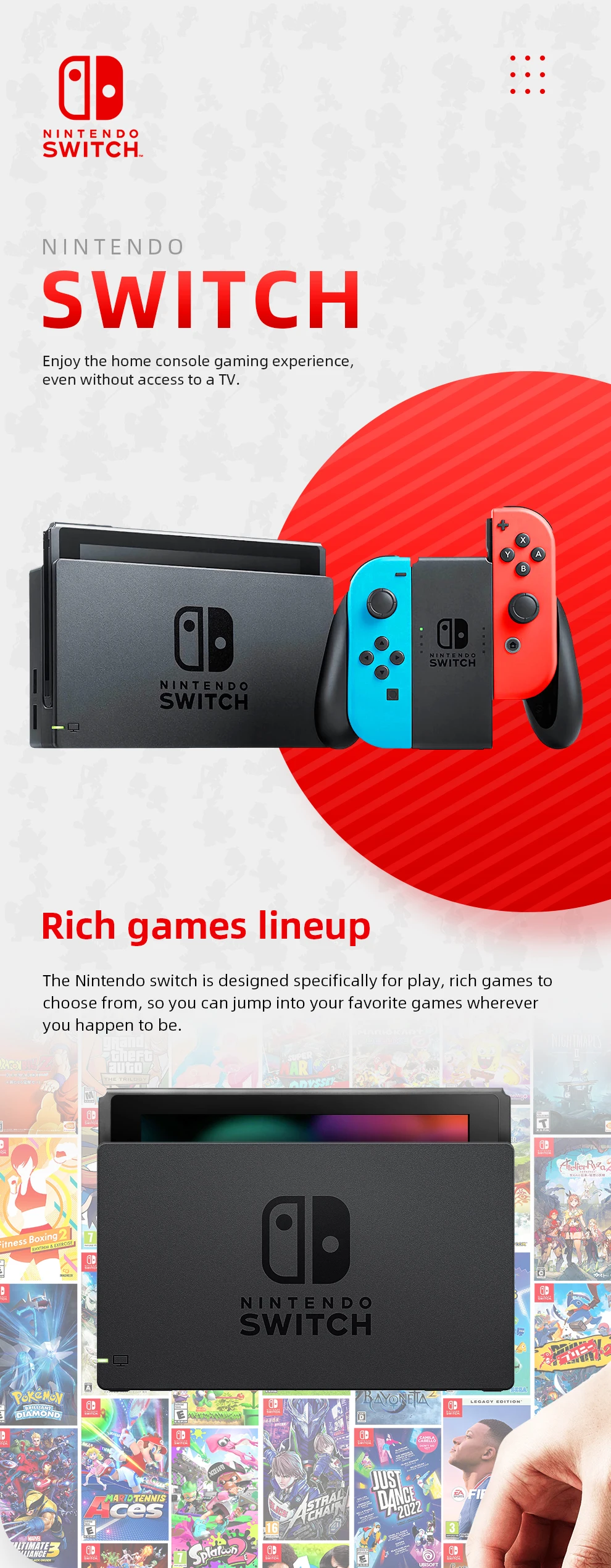 Introducing Nintendo Switch, the new home video game system from Nintendo. In addition to providing single and multiplayer thrills at home, the Nintendo Switch system can be taken on the go so players can enjoy a full home console experience anytime, anywhere. The mobility of a handheld is now added to the power of a home gaming system, with unprecedented new play styles brought to life by the two new Joy-Con controllers.