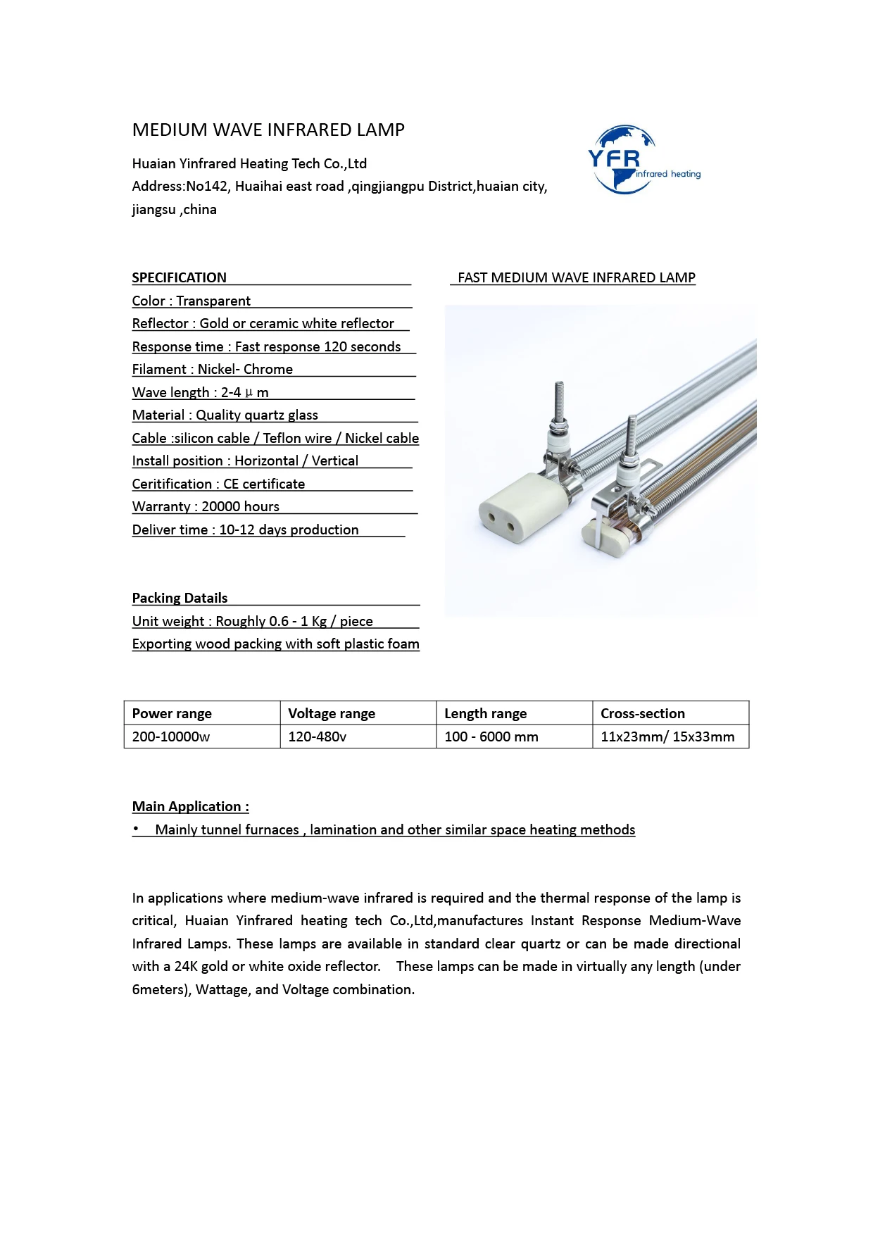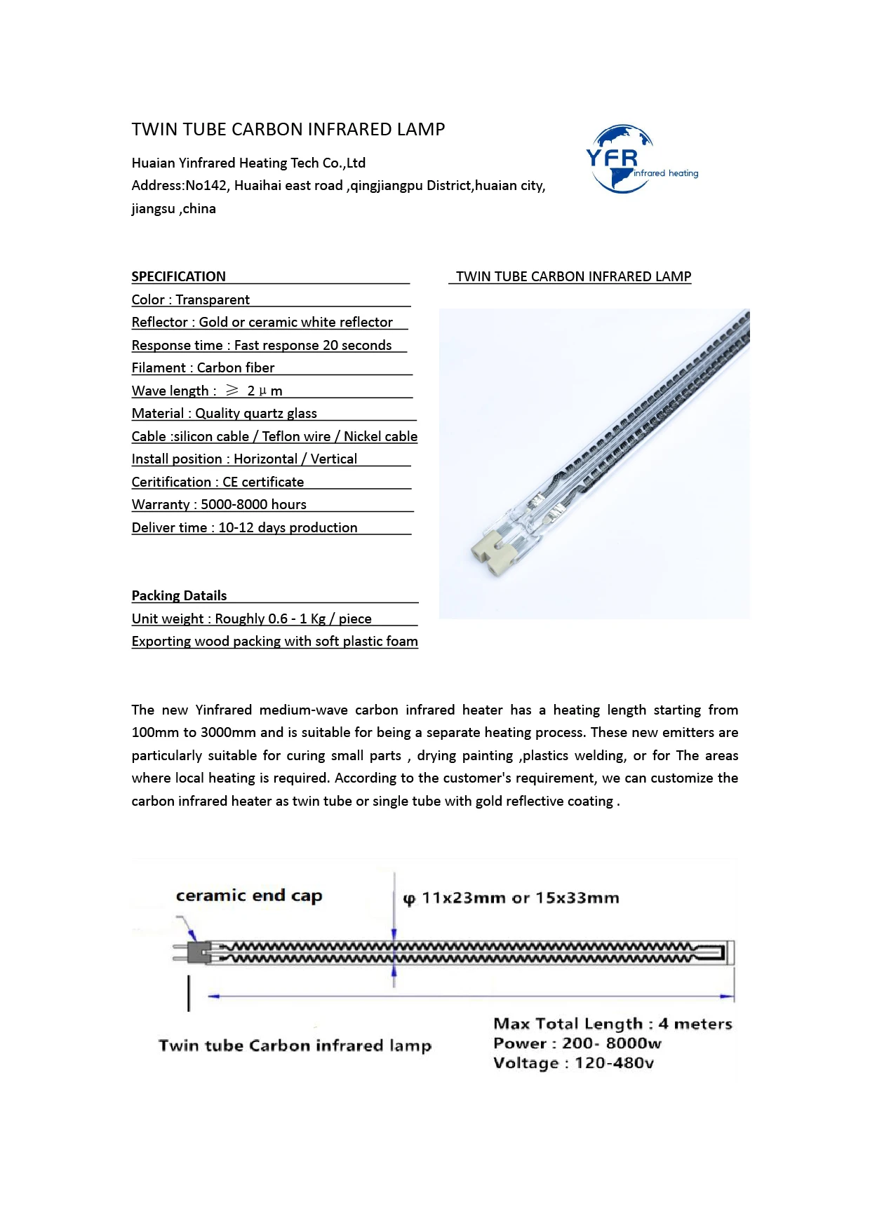 Huaian yinfrar предназначен для обеспечения высокого качества двойной трубки Кварцевые инфракрасные лампы на рынке. Мы производим средне-волновые, быстрые средне-волновые и двухволновые трубные лампы как в 23 мм x 11 мм, так и в 33 мм x 15 мм кварце. Наши лампы могут быть изготовлены с высокотемпературным отражателем белого оксида, с высокой эффективностью 23K золотого рефлектора или без кварца.