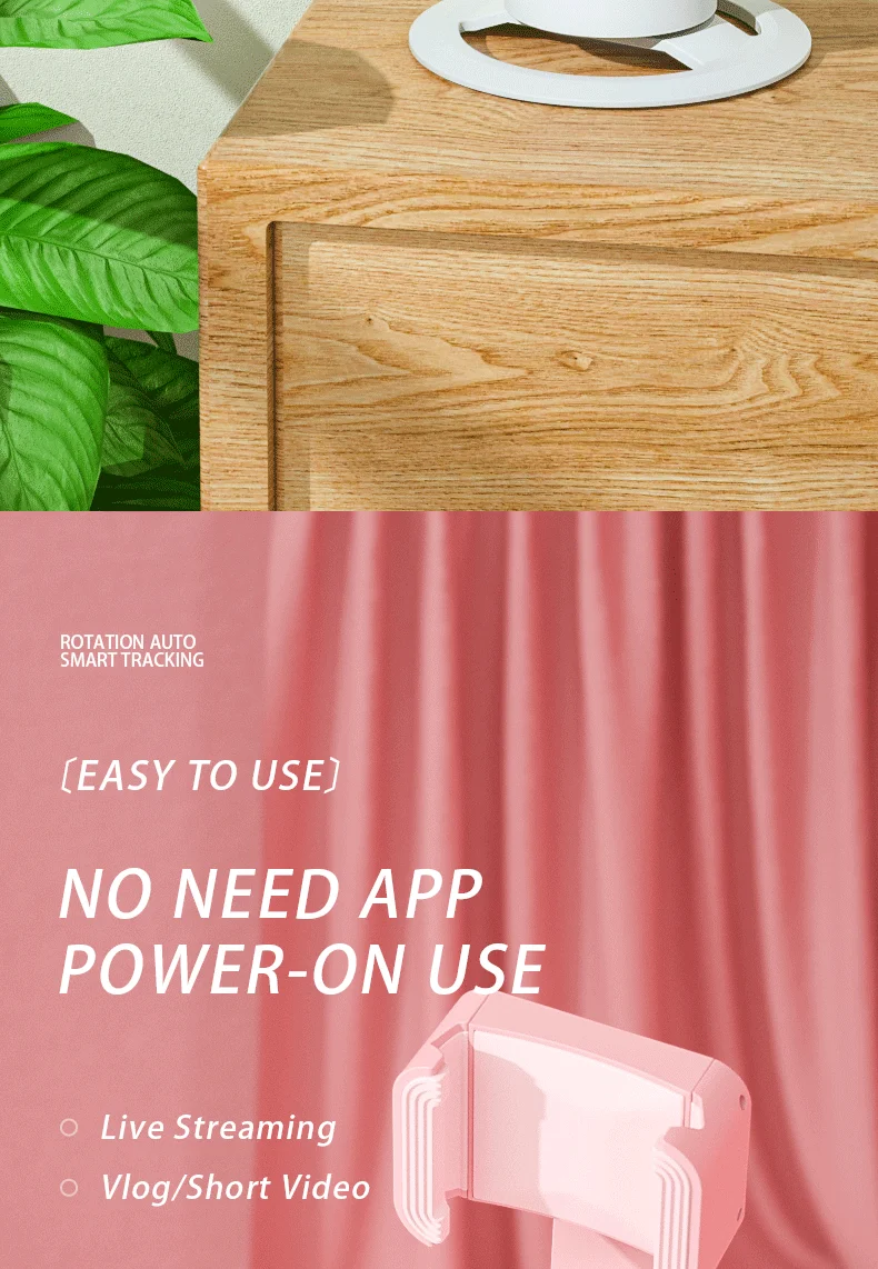 Просто удерживайте кнопку питания в течение 3 секунд, чтобы включить этот умный держатель телефона, он будет автоматически выполнять Обнаружение вращения в течение 3 секунд, затем объектив вращается на 360 ° по горизонтали, чтобы отслеживать ваше движение. Вы также можете поместить свой телефон на штатив для отслеживания лица, чтобы наслаждаться просмотром видео вместо того, чтобы держать телефон руками.